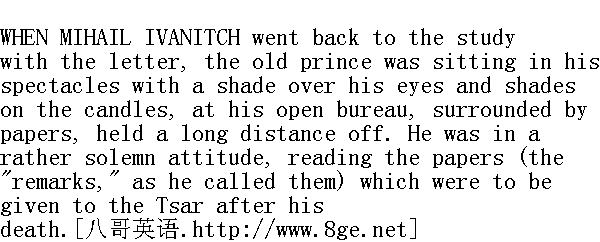 当米哈伊尔·伊万内奇拿着信回到书房的时候, 公爵戴着眼镜和眼罩在蜡烛罩灯的前面, 靠近打开的办公桌傍边坐着, 拿着文件的手伸得很远, 摆出一副有点儿庄严的姿势, 在读他死后将呈送给皇帝御览的文件(他称之为说明书)。 When Mihail Ivanitch went in, there were tears in his eyes, called up by the memory of the time when he had written what he was now reading. He took the letter out of Mihail Ivanitch's hand, put it in his pocket, folded up his papers and called in Alpatitch, who had been waiting a long while to see him. 米哈伊尔·伊万内奇进房时, 公爵含着眼泪回忆他当初写的。而现在他看着的文件。后来他从米哈伊尔·伊万内奇手中拿到信, 便放到衣袋里, 搁好文件, 才把等了好久的阿尔帕特奇叫来。 He had noted down on a sheet of paper what he wanted in Smolensk, and he began walking up and down the room, as he gave his instructions to Alpatitch, standing at the door. 他在一张小纸条上写着去斯摩棱斯克要办的事, 接着他在房里, 一面从站在门边等候的阿尔帕特奇面前来回走动, 一面发出命令。 "First, letter paper, do you hear, eight quires, like this pattern, you see; gilt edged ... take the pattern, so as to be sure to match it; varnish, sealing-wax - according to Mihail Ivanitch's list."" 听着!信笺, 要八帖, 就是这个样品;金边的......一定要照这个样;清漆, 火漆(封蜡)--按照米哈伊尔·伊万内奇开的单子办。" He walked up and down the room and glanced at the memorandum. 他在房里走了一会儿, 看了看备忘录。