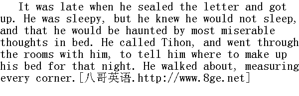 当他封好了信, 站起来的时候, 已经很晚了。他想要睡觉, 但是他知道他睡不着, 在床上会出现最坏的想法。他叫来了吉洪, 同他一起走了几个房间, 以便告诉他今晚把床放到哪里。他走来走去, 打量着每个屋角。 There was no place that pleased him, but worst of all was the couch in the study that he had been used to. That couch had become an object of dread to him, probably from the painful thoughts he had thought lying on it. No place was quite right, but best of them all was the corner in the divan-room, behind the piano; he had never slept there yet. 他觉得到处都不好。最不好的是书房里他睡惯了的那张沙发。他觉得这张沙发很可怕, 大概是因为他躺在上面反复思量过使人极不愉快的事情。什么地方都不好, 但是最好的地方还是休息室大钢琴后面的那个角落, 因为他还有在这里睡过。 Tihon brought the bedstead in with the footmen, and began putting it up. 吉洪和一个仆人搬来一张床, 开始铺起来。 "That's not right, that's not right!" cried the old prince. With his own hands he moved the bed an inch further from the corner, and then closer to it again." 不是这样!不是这样!"公爵大声说罢, 便亲自把床拉得远离墙角的四分之一, 然后又拉近一些。 "Well, at last, I have done everything; now I shall rest," thought the prince, and he left it to Tihon to undress him." 好, 我终于把事做完了, 现在我要休息了。"公爵想了想说, 于是他让吉洪给他脱衣服。