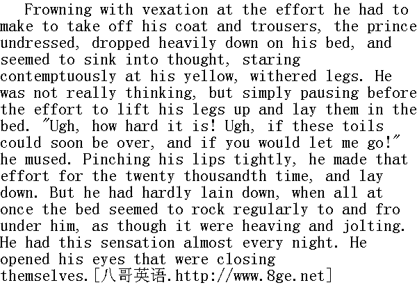 由于脱上衣和裤子需要费力, 公爵烦恼地皱着眉头, 脱了衣服, 他困难地往床上一坐, 似乎在沉思, 轻蔑地瞅着他那焦黄枯瘦的双腿。他不是在沉思, 而是在拖延把两条腿费力地抬起来上床的时间。"啊呀;多么困难!啊呀, 哪怕快一点结束这些劳动也好!您放我走吧!"他想, 他咬紧嘴唇, 费了九牛二虎之力才躺了下来。但是他刚一躺下, 便突然觉得整个床就在他身子下面均匀地晃来晃去着, 好像在沉重地喘气和冲撞。几乎每天夜里都是这样。他睁开了刚闭上的眼睛。 "No peace, damn them!" he grumbled, with inward rage at some persons unknown. "Yes, yes, there was something else of importance - something of great importance I was saving up to think of in bed. The bolts? No, I did speak about them. No, there was something, something in the drawing-room. Princess Marya talked some nonsense. Dessalle - he's a fool - said something, something in my pocket - I don't remember."" 不得安宁, 该死的东西!"他愤怒地不知对谁埋怨了几句。"是的, 是的, 还有一件重要的事, 而且非常重要, 我留待夜里上了床才办的。门闩吗?不是, 这件事我已交待过了。不是, 大概还有那么一件事, 在客厅里提到过的。玛丽亚公爵小姐不知因为什么撒了谎。德萨尔--这个傻瓜, 不知说了点什么。衣袋里有点东西, --我记不得了。" "Tishka! what were we talking about at dinner?"" 季什卡!吃饭的时候讲到过什么?" "About Prince Mihail ..."" 讲到过米哈伊尔公爵......" "Stay, stay" - the prince slapped his hand down on the table. "Yes, I know, Prince Andrey's letter. Princess Marya read it. Dessalle said something about Vitebsk. I'll read it now."" 别说了, 别说了。"公爵用手拍桌子。"是的, 我知道了, 安德烈公爵的信, 玛丽亚公爵小姐还念过。德萨尔不知说过维捷布斯克什么。现在我来念。"