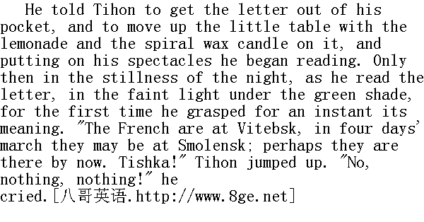 他吩咐人把信从衣袋里拿出来, 并把一张摆着一杯柠檬水和一支螺纹蜡烛的小桌子移到床边, 便戴上眼镜, 开始看起信来。在这个时候, 他只有在夜深人静之中, 在蓝灯罩下的弱光里看着信, 这才第一次瞬间悟出信里说的意思。"法军到了维捷布斯克, 再过四昼夜的行程, 他们就可能到斯摩棱斯克了;也许他们已经到那里了。""季什卡!"吉洪一跃而起。"不, 不要了, 不要了!"他大声说。 He put the letter under the candlestick and closed his eyes. And there rose before his mind the Danube, bright midday, the reeds, the Russian camp, and he, a young general, without one wrinkle on his brow, bold, gay, ruddy, entering Potyomkin's gay-coloured tent, and the burning sensation of envy of the favourite stirs within him as keenly as at the time. And he recalls every word uttered at that first interview with Potyomkin. And then he sees a plump, short woman with a sallow, fat face, the mother empress, her smiles and words at her first gracious reception for him; and then her face as she lay on the bier, and the quarrel with Zubov over her coffin for the right to kiss her hand 他把信藏在烛台下面, 闭上了眼睛。于是他想起了多瑙河, 明朗的中午, 芦苇, 俄国营地;他这个年轻的将军, 脸上没有一条皱纹, 精力充沛, 心情愉快, 面色红润, 走进波将金的彩饰帐篷, 对朝廷这个宠臣如火焚似的嫉妒心理强烈, 现在仍然像当时一样使他激动。从而他回想起和波将金初次见面时所说的话, 这时他眼前又出现那位个儿不高, 胖脸蜡黄的皇太后, 第一次亲切地接见他时露出的笑容和她说的话;同时他又回想起来她在灵台上的面容, 以及在御棺傍边为了吻她的手的权利而与祖博夫之间发生冲突的情景。 "Oh, to make haste, to make haste back to that time, and oh, that the present might soon be over and they might leave me in peace!"" 唉, 快点, 快点回到那个时代去吧, 让现在的一切快一点, 快一点结束吧!叫他们不要打搅我, 让我安静一下吧!"