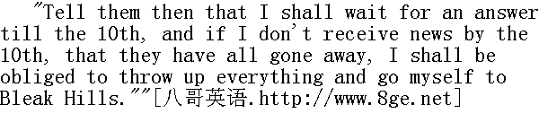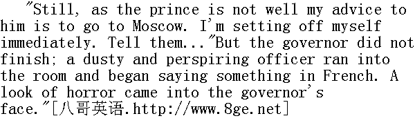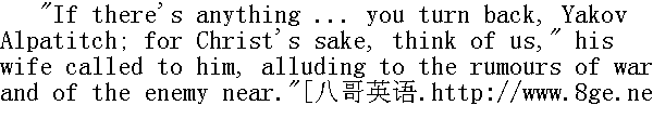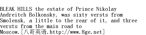 尼古拉·安德烈伊奇·博尔孔斯基公爵的庄园、童山, 在斯摩棱斯克背后六十俄里, 离莫斯科大道三俄里。 The same evening on which the old prince gave Alpatitch his instructions, Dessalle asked for a few words with Princess Marya, and told her that since the prince was not quite well and was taking no steps to secure his own safety, though from Prince Andrey's letter it was plain that to stay on at Bleak Hills was not free from danger, he respectfully advised her to write herself, and send by Alpatitch a letter to the governor at Smolensk, and to ask him to let her know the position of affairs and the degree of danger they were running at Bleak Hills. Dessalle wrote the letter to the governor for Princess Marya and she signed it, and the letter was given to Alpatitch with instructions to give it to the governor, and in case there was danger, to come back as quickly as possible.When he had received all his orders, Alpatitch put on his white beaver hat - a gift from the prince - and carrying a stick in his hand, like the prince, went out, accompanied by all his household, to get into the leather gig harnessed to three sleek, roan horses. 就在公爵给阿尔帕特奇作指示的那天晚上, 德萨尔求见玛丽亚公爵小姐, 告诉她说, 鉴于公爵健康欠佳, 而且对自己的安全也未采取任何措施, 而据安德烈公爵的来信看, 显然留在童山是不安全的, 因此他恭敬地劝她亲自给总督写一封信, 让阿尔帕特奇带到斯摩棱斯克, 求他把战局和童山所受到的威胁程度告诉她。德萨尔替玛丽亚公爵小姐代笔写了一封信给总督的信, 由她签了名, 才把这封信交给阿尔帕特奇, 命令他呈送总督。如遇到危险, 就尽快赶回来。阿尔帕特奇接到指示后, 就戴上白绒毛帽子(公爵的礼物), 像公爵似的拿着手杖, 由家里的人伴送, 一出门就坐上了驾三匹肥壮的、毛色黄褐而黑鬃的马拉的皮篷马车。 The bells were tied up and stuffed with paper. The prince allowed no one at Bleak Hills to drive with bells. But Alpatitch loved to have bells ringing when he went a long journey. All Alpatitch's satellites, the counting-house clerk, the servants' cook and the head cook, two old women, a foot-boy, a coachman, and various other servants saw him off. 大铃铛包了起来, 小铃铛也塞满了纸, 因为公爵不让人在童山坐带铃铛的马车。但是阿尔帕特奇却喜欢在出远门时乘坐的车带着大小的铃铛。阿尔帕特奇的"朝臣"们--行政长官, 事务员, 厨娘(一黑一白的两个老太太), 哥萨克小孩, 马车夫以及各种农奴;都出来为他送行。 His daughter put chintz-covered, down pillows under him and behind his back. His old sister-in-law slyly popped in a kerchief full of things. One of the coachmen helped him to get in. 他的女儿把印花色彩的鸭绒坐垫放在他背靠背后面和身下, 老姨子还偷偷地塞给他一小包东西。然后才由一个马车夫搀扶着他上车。 "There, there, women's fuss! Women folk, women folk!" said Alpatitch, puffing and talking rapidly, just as the old prince used to talk. He sat down in the gig, giving the counting-house clerk his last directions about the work to be done in the fields; and then dropping his imitation of the prince, Alpatitch took his hat off his bald head and crossed himself three times." 嘿, 老娘儿们全出动!老娘儿们, 老娘儿们!"阿尔帕特奇正像老公爵, 气喘吁吁地、急促地说了才坐上车去。同时对行政长官作了有关事务性的最后指示。这次他不再照公爵那样了, 从秃头上取下帽子, 画了三次十字。