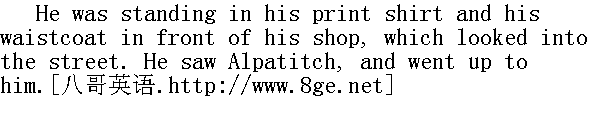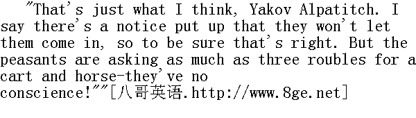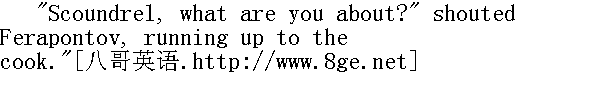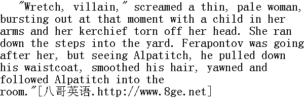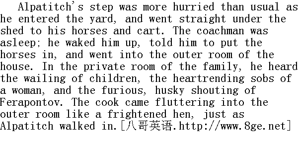 阿尔帕特奇迈着比平时更为匆忙的步伐向旅店走进去, 直接走到停放他的车马棚那里。车夫睡着了, 他叫醒他, 吩咐套马, 然后走进穿堂。在店主的正房里听见有个孩子的哭声, 一个妇女撕肝裂肺的号啕声, 费拉蓬托夫嘶哑的愤怒的尖叫声。这时阿尔帕特奇刚一进门来, 厨娘像一只受惊的母鸡一样, 正在穿堂里乱窜。 "He's beating her to death-beating the mistress!...He's beaten her so, thrashed her so!..."" 打死人了, --老板娘给打死了!......又打, 又拖啊!......" "What for?" asked Alpatitch." 为了什么?"阿尔帕特奇问。 "She kept begging to go away. A woman's way! Take me away, says she; don't bring me to ruin with all my little children; folks are all gone, says she, what are we about? So he fell to beating her...beating and thrashing her!"" 她央求离开这里。妇道人家嘛!她说;你带我走吧!不要让我和小孩子们一起都毁掉了吧;人家都走光了, 她又说, 咱们干吗不走?于是就开始打她了。而且又打;又拖呀!" Alpatitch nodded his head, apparently in approval at those words; and not caring to hear more he went towards the door on the opposite side leading to the room in which his purchases had been left. 阿尔帕特奇听到这番话后, 好像是赞同地点了点头, 但又不想再听下去, 便向对面店主正房的门口走去, 因为他买的东西放在这里。