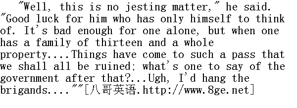 要知道, 这不是闹着玩的!"他说, "单独一个人谁都好办。一个人倒霉一人当, 可是一家十三口人, 还有全部的财产......弄得家破人亡, 这算个什么长官呀?......哎, 就该绞死这帮强盗......" "Come, come, hush!" said the other." 行啦!得啦!"另一位贵族绅士说。 "What do I care! let him hear! Why, we're not dogs!" said the former police-captain, and looking round, he caught sight of Alpatitch." 我犯什么法, 让他听见好了!我们又不是狗。"前任警察局长说罢, 便回头看了一下, 看见了阿尔帕特奇。 "Ah, Yakov Alpatitch, how do you come here?"" 啊, 雅科夫·阿尔帕特奇, 你来干什么?" "By command of his excellency to his honour the governor," answered Alpatitch, lifting his head proudly and putting his hand into his bosom, as he always did when he mentioned the old prince...."His honour was pleased to bid me inquire into the position of affairs," he said." 奉公爵大人之命, 前来拜见总督先生。"阿尔帕特奇回答后, 才傲慢地抬起头来, 把一只手放在怀里, 每当他提起公爵时, 总是摆出这个模样......"派我来打听一下战役的局势。"他说。