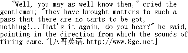 我也是这么推想的, 雅科夫·阿尔帕特奇。我说, 有了命令不让他们进来, 那就是说, 这是对的。但是庄稼汉要三个卢布的车费, 因为他们真是天良丧尽!" Yakov Alpatitch heard without heeding. He asked for a samovar, and for hay for his horses; and after drinking tea lay down to sleep. 雅科夫·阿尔帕特奇漫不经心地听着。他要了一壶茶和喂马的干草, 然后喝足了茶, 便躺下睡觉了。 All night long the troops were moving along the street by the tavern. Next day Alpatitch put on a tunic, which he kept for wearing in town, and went out to execute his commissions. It was a sunny morning, and by eight o'clock it was hot. "A precious day for the harvest," as Alpatitch thought. From early morning firing could be heard from beyond the town. 通宵达旦, 军队都在街上不停地从旅店傍边走过。第二天, 阿尔帕特奇穿上只有在城里才穿的坎肩, 出门去办事。早晨阳光灿烂, 八点钟就很热了。阿尔帕特奇认为, 是收割庄稼的好日子。从早晨起就听得见城外的枪声。 At eight o'clock the boom of cannon mingled with the rattle of musketry. The streets were thronged with people, hurrying about, and also with soldiers, but drivers plied for hire, the shopkeepers stood at their shops, and services were being held in the churches just as usual. Alpatitch went to the shops, to the government offices, to the post and to the governor's. Everywhere that he went every one was talking of the war, and of the enemy who was attacking the town. All were asking one another what was to be done, and trying to calm each other's fears. 从早晨八点开始, 步枪声中夹杂着大炮的轰鸣, 街上有许多不知往何处急急忙忙走着的行人, 也还有士兵, 但仍和平时一样, 马车来来往往, 商人站在店铺里, 教堂里做礼拜。阿尔帕特奇走遍商店、政府机关和邮局, 并看望了总督。在政府机关、商店和邮局里, 大家都在谈论军队, 谈论已经开始攻城的敌人;大家都在互相探询应该怎么办, 大家都在竭力互相安慰安慰。 At the governor's house, Alpatitch found a great number of people, and saw Cossacks, and a travelling carriage belonging to the governor at the entrance. On the steps Yakov Alpatitch met two gentlemen, one of whom he knew. This gentleman, a former police-captain, was speaking with great heat. 阿尔帕特奇在总督住它的前边发现有许多人, 哥萨克士兵和总督的一辆旅行马车。雅科夫·阿尔帕特奇在台阶上遇到两个贵族绅士, 其中有一个他认识。他认识的那个贵族绅士过去当过县警察局长, 正在激动地说: