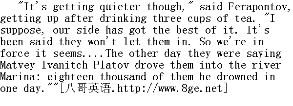 好呀!来吧!弟兄们, 好呀......。""这是本店的人!"异口同声地说。 "So you tell them everything I have told you," said Prince Andrey, addressing Alpatitch. And without bestowing a word on Berg, who stood mute beside him, he put spurs to his horse and rode down the lane." 那, 那么, "安德烈公爵问阿尔帕特奇说, "把我向你所说的一切都转告给他们。"但他一句话也没有回答那默默不语地站在他身旁的贝格, 摸了一下马, 便走到胡同里去了。
