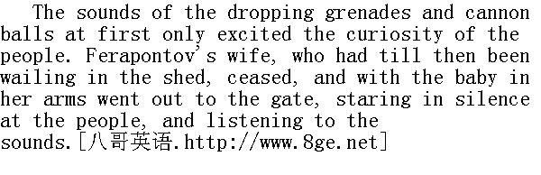 榴弹和炮弹降落的声音, 开始只引起了人们的好奇心。费拉蓬托夫的妻子在板棚里不停地哭到现在, 她也不作声了, 抱着孩子向大门口走去, 默默地望着行人, 倾听着枪炮声。 The cook and shopman came out to the gate. All of them were trying with eager curiosity to get a glimpse of the projectiles as they flew over their heads. Several persons came round the corner in eager conversation. 厨娘和一个伙计也来到大门口。大家都怀着愉快的好奇心情, 竭力看一看从他们头上飞过去的炮弹。从街的拐角处过来几个人, 他们正在兴奋地谈论着什么。 "What force!" one was saying; "roof and ceiling were smashed up to splinters."" 这真威力大!"有一个人说, "把房顶和天花板都打得碎片纷飞。" "Like a pig routing into the earth, it went!" said another." 像猪拱土一样。"另一个人说。 "Isn't it first-rate? Wakes one up!" he said laughing." 多么带劲!好大的威力!"他笑着说。