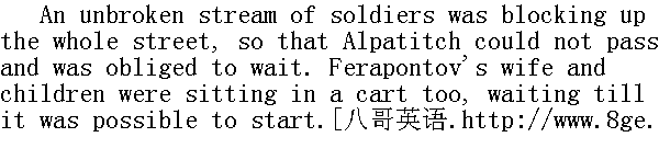 混蛋, 你这是干什么?"店主喊叫一声, 便向厨娘跑去。 At the same instant there rose a piteous wailing from the women; the baby set up a terrified howling, and the people crowded with pale faces round the cook. Above them all rose out of the crowd the moans and cries of the cook. 就在这一瞬间, 四面八方的妇女都悲惨地呼号, 一个小孩也惊恐地哭起来, 人们面色苍白, 默默地群集在厨娘的周围。在这一人群之中, 厨娘的呻吟声和说话声听起来至今清晰。 "O-o-oy, good kind souls, blessed friends! don't let me die! Good kind souls!..."" 唉哟, 我的好人啊!我的亲人啊!别让我死啊!我的好人啊!......" Five minutes later no one was left in the street. The cook, with her leg broken by the bursting grenade, had been carried into the kitchen. Alpatitch, his coachman, Ferapontov's wife and children and the porter were sitting in the cellar listening. The thunder of the cannon, the hiss of the balls, and the piteous moaning of the cook, which rose above all the noise, never ceased for an instant. Ferapontov's wife alternately dandled and soothed her baby, and asked in a frightened whisper of every one who came into the cellar where was her husband, who had remained in the street. The shopman told her the master had gone with the crowd to the cathedral, where they were raising on high the wonder-working, holy picture of Smolensk. 五分钟后, 街上空无一人。榴弹碎片打伤了厨娘的大腿, 有人把她抬到厨房里。阿尔帕特奇、他的车夫、费拉蓬托夫的妻子和几个孩子们, 还有看门的都坐在地窖里听候外面的动静。隆隆的炮声、炮弹的呼啸声和厨娘比其他人的声音都高的、可怜的哀号声, 一刻也没有停止过。旅店老板娘时而摇晃哄着孩子, 时而用可怜的低语问所有进地窖的人, 她的留在街上的丈夫在哪里。进地窖的伙计告诉她说, 店主和其他人都到大教堂那里抬斯摩棱斯克显灵的圣像去了。 Towards dusk the cannonade began to subside. Alpatitch came out of the cellar and stood in the doorway.The clear evening sky was all overcast with smoke. And a new crescent moon looked strange, shining high up in the sky, through that smoke. After the terrible thunder of the cannons had ceased, a hush seemed to hang over the town, broken only by the footsteps, which seemed all over the town, the sound of groans and distant shouts, and the crackle of fires. The cook's moans had ceased now. On two sides black clouds of smoke from fires rose up and drifted away. Soldiers in different uniforms walked and ran about the streets in different directions, not in ranks, but like ants out of a disturbed ant heap. Several of them ran in Ferapontov's yard before Alpatitch's eyes. He went out to the gate. A regiment, crowded and hurrying, blocked up the street, going back. 接近黄昏时, 炮弹声开始平静下来。阿尔帕特奇从地窖里走出来, 站在门口边。开初明朗的夜空还弥漫着烟雾, 然后一轮新月高悬中天, 透过烟雾奇异地闪光。在原先可怕的炮声停止后, 城市的上空显得寂静了, 好像只有满城的脚步声, 呻吟声, 遥远的喊叫声和着大的毕剥声打破了沉寂。厨娘的呻吟声现在也静下来了。有两处、团团的黑烟腾空而起, 扩散开来。穿着各种制服的士兵, 好像是从捣毁了的蚁巢中逃出来的蚂蚁一样, 不成队列地朝着不同的方向, 走的走, 跑的跑。阿尔帕特奇亲眼看见其中几个士兵向费拉蓬托夫的院子跑去。而他也走到大门口去了。有一个团前拥后挤地匆忙往后撤退, 把街道都堵塞起来了。