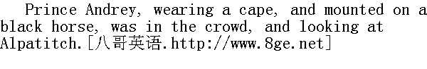 安德烈公爵穿着外套, 骑着一匹乌黑的马, 正站在人群后边望着阿尔帕特奇。 "How did you come here?" he asked." 你怎么到这儿来了!"他问。 "Your...your excellency!" Alpatitch articulated, and he broke into sobs...."Your, your...is it all over with us, really? Master..."" 公......公爵大人!"阿尔帕特奇说着说着说哭起来了......"公......公爵大人, 我们完蛋了吗?我的上帝!......" "How is it you are here?" repeated Prince Andrey. The flames flared up at that instant, and Alpatitch saw in the bright light his young master's pale and worn face. Alpatitch told him how he had been sent to the town and had difficulty in getting away." 你怎么到这儿来了!"安德烈公爵又问。这时, 火焰明亮地燃烧起来, 照亮了阿尔帕特奇的小主人苍白而憔悴的脸。阿尔帕特奇讲了, 他是怎样被派到这里, 又好不容易才走了出来。 "What do you say, your excellency, is it all over with us?" he asked again." 怎么, 公爵大人, 我们真的完蛋了吗?"他又问。