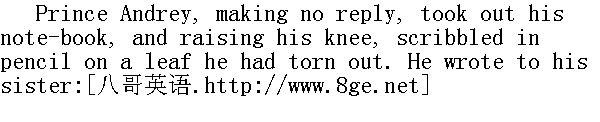 安德烈公爵没有作回答, 他掏出笔记本, 抬起膝盖, 在撕下的一页纸上用铅笔给他的妹妹写道: "Smolensk has surrendered," he wrote. "Bleak Hills will be occupied by the enemy within a week. Set off at once for Moscow. Let me know at once when you start; send a messenger to Usvyazh."" 斯摩棱斯克要放弃了!一星期之后童山将被敌人所占领。你们立刻动身去莫斯科。马上告诉我, 何时上路, 并派一名信使去乌斯维亚日。" Scribbling these words, and giving Alpatitch the paper, he gave him further directions about sending off the old prince, the princess and his son with his tutor, and how and where to let him hear, as soon as they had gone. Before he had finished giving those instructions, a staff officer, followed by his suite, galloped up to him. 他写完后, 就把那张便笺交给阿尔帕特奇, 还口头交待他, 怎样照料公爵、公爵小姐、他的儿子和教师上路, 怎样立刻回信并把信寄到哪里。他还未来得及说完这些指示, 便有一个参谋长, 带着侍从骑马向他奔驰而来。 "You a colonel," shouted the staff officer, in a voice Prince Andrey knew speaking with a German accent. "Houses are being set on fire in your presence and you stand still! What's the meaning of it? You will answer for it," shouted Berg, who was now assistant to the head of the staff of the assistant of the chief officer of the staff of the commander of the left flank of the infantry of the first army, a very agreeable and prominent position, so Berg said." 您是团长吗?"参谋长用安德烈公爵熟悉的德语口音喊道。"当着您的面烧房子, 您却站着不动?这意味着什么?您要负责!"贝格叫嚷着, 他现在是第一军步兵左翼司令官的副参谋长, 正如贝格所说, 这是一个显然很称心的美差。 Prince Andrey stared at him, and without making any reply went on addressing Alpatitch. 安德烈公爵望了望他, 没有答理, 继续向阿尔帕特奇说:
