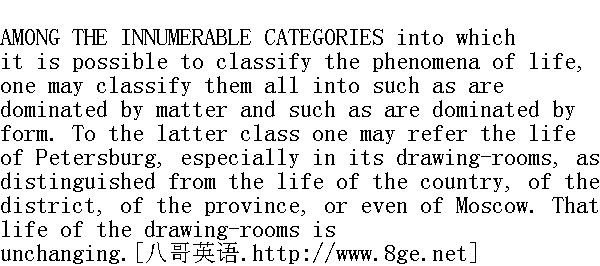 对生活现象, 可分成无数部类, 所有这些部类可以划分成以下二类, 其中一类以内容为主, 另外一类--则以形式为主。属于这后一类别的, 是截然不同于乡下的, 地方的, 省城的, 甚至莫斯科的生活的彼得堡的生活, 尤其是沙龙生活。 这种生活是不变的。 Between the years 1805 and 1812 we had made peace with Bonaparte and quarrelled with him again; we had made new constitutions and unmade them again, but the salons of Anna Pavlovna and of Ellen were precisely as they had been-the former seven, the latter five years-before. Anna Pavlovna's circle were still speaking with incredulous wonder of Bonaparte's successes; and saw in his successes, and in the submissive attitude of the sovereigns of Europe, a malicious conspiracy, the sole aim of which was to give annoyance and anxiety to the court circle of which Anna Pavlovna was the representative. The set that gathered about Ellen, whom no less a person than Rumyantsev condescended to visit, and looked on as a remarkably intelligent woman, talked in 1812 with the same enthusiasm as in 1808, of the "great nation," and the "great man," and regretted the breach with France, which must, they believed, shortly end in peace. 自从一八○五年以来, 我们同波拿巴又和解又断交, 多次立了宪法又废除它, 而安娜·帕夫洛夫娜的沙龙和海伦的沙龙从前怎样, 现在还怎样--一个跟七年前一样, 另一个跟五年前一样, 在安娜·帕夫洛夫娜那里, 人们依旧困惑地谈论波拿巴的成功, 并且看到, 无论在他的成功还是在欧洲君主对他的姑息中, 都有一种恶毒的阴谋, 其唯一目的便是给安娜·帕夫洛夫娜代表的宫廷集团制造不快和烦恼。在海伦那里也完全一样(鲁缅采夫本人常去光顾, 认为她是绝顶聪明的女人), 一八○八和一八一二毫无二致, 人们依然兴奋地谈论着那个伟大的民族和那个伟大的人物, 并遗憾地看待同法国的决裂, 依照聚集在海伦沙龙里的人的意见, 此事应以和平告终。 Of late after the Tsar's return from the army, some increase of excitement was perceptible in these antagonistic salons, and they made something like demonstrations of hostility to one another, but the bias of each circle remained unaffected. Anna Pavlovna's set refused to admit any French people but the most unimpeachable legitimists; and in her drawing-room the patriotic view found expression that the French theatre ought not to be patronised, and that the maintenance of the French company there cost as much as the maintenance of a whole army corps. The progress of the war was eagerly followed, and rumours greatly to the advantage of our army were circulated. In the circle of Ellen, of Rumyantsev, the French circle, the reports of the enemy's cruelty and barbarous methods of warfare were discredited; and all sorts of conciliatory efforts on the part of Napoleon were discussed. This set discountenanced the premature counsels of those who advised preparations for the removal to Kazan of the court and the girls' schools, that were under the protection of the empress mother. The whole war was in fact regarded in Ellen's salon as a series of merely formal demonstrations, very shortly to be terminated by peace; and the view prevailed, expressed by Bilibin, who was now in Petersburg and constantly seen at Ellen's, as every man of wit was sure to be, that the war would be ended not by gunpowder but by those who had invented it. The patriotic fervour of Moscow, of which tidings reached Petersburg with the Tsar, was in Ellen's salon a subject of ironical, and very witty, though circumspect, raillery. 近来, 在皇上从军队返驾之后, 这两个对立的沙龙集团出现了某种不安, 发生了某些相互指责的情况, 但两个集团的方向仍旧不变。参加安娜·帕夫洛夫娜集团的法国人仅限于顽固的保皇党, 所以, 这里表现出来的爱国思想是, 不该上法国剧院, 认为维持一个剧团的经费抵得上维持一个军团的经费。他们专心地注视战事进展, 并传播对我军最有利的新闻。在海伦的圈子内, 即鲁缅采夫派和法国派的圈子内, 关于战争和敌人残酷的传闻受到驳斥, 拿破仑求和的各种尝试被加以讨论。在这个圈子里, 人们谴责那些建议尽早下令, 让皇太后保护的宫廷女子学堂准备向喀山疏散的人。总的说来, 战争的全部内容在海伦的沙龙里不过是以一些空洞的示威开始, 很快就会以和平告终, 而左右一切的是比利宾的意见, 他现时在彼得堡成了海伦的常客(所有聪明的人都应去她那里作客), 他认为问题不取决于火药, 而取决于发明火药的人。在这个圈子里, 人们冷嘲热讽而又十分巧妙地(尽管也很谨慎地)讥笑莫斯科的狂热, 关于那种狂热的消息, 是随皇上驾临彼得堡而传来的。 In Anna Pavlovna's circle, on the contrary, these patriotic demonstrations roused the greatest enthusiasm, and were spoken of as Plutarch speaks of his ancient Romans. Prince Vassily, who still filled the same important positions, constituted the connecting link between the two circles. He used to visit "my good friend Anna Pavlovna," and was also seen in the "diplomatic salon of my daughter"; and often was led into blunders from his frequent transitions from one to the other, and said in one drawing-room what should have been reserved for the other. 在安娜·帕夫洛夫娜的圈子里则相反, 人们赞美和谈论那种狂热, 像普鲁塔克①谈论远古伟人似的。依旧身居要职的瓦西里公爵, 成了两个圈子的连环扣。他到ma bonne amie(自己的尊贵朋友)安娜·帕夫洛夫娜那里去, 也到dans le salon diplomatique de ma fille(自己女儿的外交沙龙)那里去, 由于频繁交替地出入于这一阵营和另一阵营之间, 因此常常给搞糊涂了, 在海伦