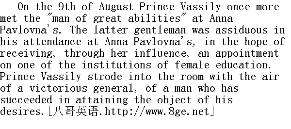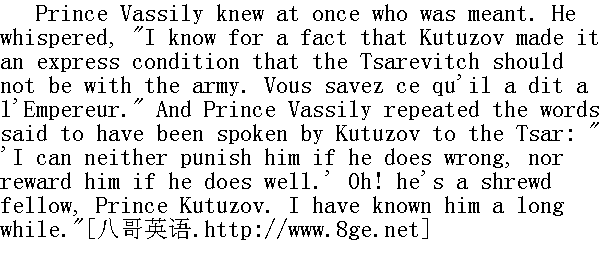 "Well, you know the great news! Prince Kutuzov is marshal! All differences of opinion are at an end. I am so glad, so delighted!" said Prince Vassily. "At last here is a man!" he declared, looking sternly and significantly at all the company. In spite of his desire to secure the post he coveted, the "man of great abilities" could not refrain from reminding Prince Vassily of the view he had expressed shortly before. (This was a breach of civility to Prince Vassily in Anna Pavlovna's drawing-room, and also to Anna Pavlovna, who had received the tidings with equal enthusiasm; but he could not refrain.) 八月九日, 瓦西里公爵又在安娜·帕夫洛夫娜家遇到了l'homme de beaucoup de merite(那个有许多优点的人)。l'homme de beaucoup de merite瓦西里公爵近来对安娜·帕夫洛夫娜很殷勤, 希望获得一个女子学校学监的任命。他走进客厅时, 像达到目的的胜利者那样喜气洋洋。"Eh bien, vous savez la grande nouvelle?Le prince Koutouzoff est marechal①。一切分歧消除了。我真幸福, 真高兴!"瓦西里公爵说。"Enfin voila un homme"②, 他不停地说, 意味深长地严肃地环视所有在客厅里的人。L'homme de beaucoup de merite虽然意在谋职, 仍忍不住提醒瓦西里公爵曾经发表过的议论。(这在安娜的客厅里对瓦西里公爵和已欣然得知这一消息的安娜·帕夫洛夫娜都是失礼的;但他忍耐不住。) ①法语: 呃, 你们可知道一个重大消息?库图佐夫成了元帅了。 ②法语: 毕竟是一个人才。 "But they say he is blind, prince," he said to recall to Prince Vassily his own words.