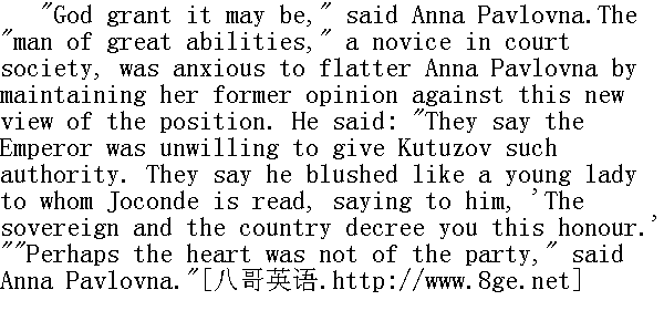 但愿如此, 但愿如此。"安娜·帕夫洛夫娜说。L'homme de beaucoup de merite(那个有许多优点人)在宫廷社交界还是个生手, 为了阿谀安娜·帕夫洛夫娜, 他以此为她先前对这一议论表示的见解解围, 说道: "据说, 陛下不大情愿授予库图佐夫这一权力。On dit qu'il rougit comme une demoiselle a laquelle on lirait Joconde, en lui disant: 'le souverain et la Patrie vous decernent cet honneur'。"①"Peut-etre que le coeur n'etait pas de la partie。②"安娜·帕夫洛夫娜说。 ①法语: 据说, 当他对他说: "国王与祖国赐与您这一荣誉"时, 他脸红得像听到诵读《约康德》的姑娘那样。(《约康德》是拉封丹的第一篇韵文故事, 被认为是恶劣的作品。)。 ②法语: 或许不完全合他的心意。 "Oh no, no," Prince Vassily maintained warmly. Now he would not put Kutuzov second to any one. To hear Prince Vassily now Kutuzov was not simply a good man in himself, but idolised by every one. "No, that's impossible, for the sovereign has always known how to appreciate him," he added." 噢不, 不, "瓦西里公爵激烈地偏袒库图佐夫, 现在已不在任何人面前让步。照瓦西里公爵的见解, 不仅库图佐夫本人出色, 而且大家都崇拜他。"不, 这不可能, 因为皇上从前就很能赏识他。"他说。 "God only grant that Prince Kutuzov may take the control of things into his own hands," said Anna Pavlovna, "and not permit any one to put a spoke in his wheel."" 但愿库图佐夫公爵, "安娜·帕夫洛夫娜说, "真正掌握着权力, 不让任何人捣鬼--des batons dans les roues."