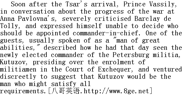 在皇上到达之后不久, 瓦西里公爵在安娜·帕夫洛夫娜那里议论战事, 严厉谴责巴克莱-德-托利, 但又对任命谁作总司令迟疑不决。客人中的一位平时被称作un homme de beaucoup de merite(有许多优点的人), 讲述了他看见新近担任彼得堡民团司令的库图佐夫在省税务局主持征募新兵的会议, 然后谨慎地表达了自己的初步看法, 库图佐夫是一个能满足各种要求的人选。 Anna Pavlovna smiled mournfully, and observed that Kutuzov had done nothing but cause the Tsar annoyance. 安娜·帕夫洛夫娜凄戚地笑了笑, 指出库图佐夫净给皇上制造不愉快, 此外便没有干过什么。 "I have said so over and over again in the assembly of nobility," interposed Prince Vassily, "but they wouldn't listen to me. I said that his election to the command of the militia would not be pleasing to his majesty. They wouldn't listen to me. It's all this mania for being in the opposition," he went on. "And to what public are they playing, I should like to know. It's all because we are trying to ape the silly enthusiasm of Moscow," said Prince Vassily, forgetting for a moment that it was at Ellen's that that enthusiasm was jeered at, while at Anna Pavlovna's it was as well to admire it. But he hastened to retrieve his mistake. "Is it suitable for Kutuzov, the oldest general in Russia, to be presiding in the Court? Et il en restera pour sa peine! Did any one hear of such a thing as appointing a man commander-in-chief who cannot sit a horse, who drops asleep at a council-a man, too, of the lowest morals! A pretty reputation he gained for himself in Bucharest! To say nothing of his qualities as a general, can we appoint, at such a moment, a man decrepit and blind-yes, simply blind! A fine idea-a blind general! He sees nothing. Playing blind-man's buff-that's all he's fit for!"" 我在贵族会上一再地说, "瓦西里公爵插嘴说道, "但没有人听我的。我说推选他作民团司令会使皇上不悦。他们没有听我的。""全是一派反对的狂热, "他继续说, "也不看看当着谁的面?而且全是由于我们想摹仿莫斯科的愚蠢的狂热。"瓦西里公爵说, 一时间糊里糊涂, 忘了在海伦那里才嘲笑莫斯科的狂热, 而在安娜·帕夫洛夫娜这里是应该加以赞扬的。但他立即改正过来。"呶, 库图佐夫伯爵, 俄国最老的将军, 在税务局那地方召集会议适当吗, et il en restera pour sa peine(他的忙碌会一事无成的)!难道可以任命为总司令的竟是一个不能跃马扬鞭的, 开会打瞌睡的, 脾气最坏的人吗!他在布加勒斯特毛遂自荐得够瞧的了?我这还不是谈他作为将军的资格问题, 难道在这种时刻能够任命一个老朽的瞎眼的人, 一个十足的瞎子吗?瞎眼将军好极了!他什么也看不见。可以捉迷藏......他简直什么都看不见!" No one opposed that view. 没有维持异议。 On the 24th of July it was accepted as perfectly correct. But on the 29th Kutuzov received the title of prince. The bestowal of this title might be taken to indicate a desire to shelve him, and therefore Prince Vassily's dictum still remained correct, though he was in no such hurry now to express it. But on the 8th of August a committee, consisting of General Field-Marshal Saltykov, Araktcheev, Vyazmitinov, Lopuhin, and Kotchubey was held to consider the progress of the war. This committee decided that the disasters were due to divided authority; and although the members of the committee were aware of the Tsar's dislike of Kutuzov, after a deliberation they advised the appointment of Kutuzov as commander-in-chief. And that same day Kutuzov was appointed commander-in-chief of the army, and intrusted with unlimited authority over the whole region occupied by the troops. 这在七月二十四日是完全公允之论。但七月二十九日库图佐夫被加封公爵头衔。授予公爵头衔可能意味着摆脱, 所以, 瓦西里公爵的见解仍然正确, 虽然他并不急于在此时有所表示, 但八月八日, 由萨尔特科夫大将, 阿拉克切耶夫, 维亚济米季诺夫, 洛普欣和科丘别伊组成的委员会, 开会讨论战争事宜。委员会一致认为, 战事之不利, 源出于无统一指挥, 虽然委员会成员知道皇上不赏识库图佐夫, 但经过简短磋商, 仍建议任命库图佐夫为总司令。因此, 就在那一天, 库图佐夫被任命为全军及各个部队据守区域的全权总司令。