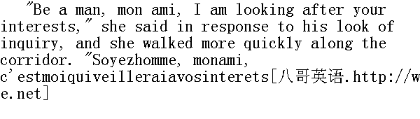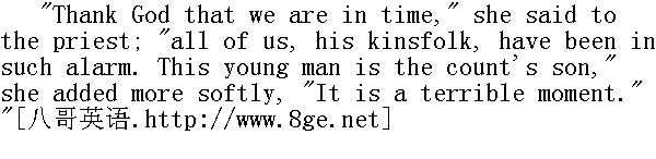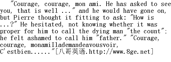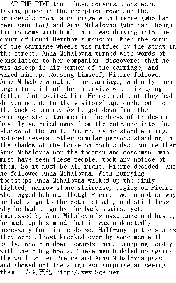 当客厅中和公爵小姐寝室中交谈正酣的时候, 皮埃尔(已着人接他回家)和安娜?米哈伊洛夫娜(她认为应当伴他同行)乘坐的四轮轿式马车开进了别祖霍夫伯爵的庭院。当马车车轮软绵绵地经过铺在窗下的麦秆上发出嘎嘎的响声时, 安娜?米哈伊洛夫娜把脸转向皮埃尔, 说了几句安慰的话, 当她弄清了, 皮埃尔正在车厢的一角睡熟了, 她便把他喊醒。皮埃尔睡醒了, 跟在安娜?米哈伊洛夫娜身后从车厢里走出来, 这时分他才想了想他要和行将就木的父亲见面的事情。他发现他们没有朝前门门口走去, 而是朝后门门口走去。他从马车踏板走下来时, 有两个穿着市侩服装的人急匆匆地从后门门口跑到墙边的暗影里。皮埃尔停了一会儿, 发现住房两边的暗影里还有几个类似模样的人。然而, 无论是安娜?米哈伊洛夫娜, 无论是仆役, 还是马车夫, 都不会望不见这几个人, 但却不去理睬他们。由此看来, 非这样不可, 皮埃尔拿定了主意, 便跟在安娜?米哈伊洛夫娜后面走去。安娜?米哈伊洛夫娜迈着急促的脚步沿着灯光暗淡的狭窄的石梯上楼, 一面招呼落在她身后的皮埃尔跟上来。虽说皮埃尔心里不明白, 他为什么真的要见伯爵, 他更不明白, 他为什么必须沿着后门的石梯上楼, 但从安娜?米哈伊洛夫娜的坚定和仓忙的样子来推敲, 他暗自断定, 非这样不行, 别无他途。在石梯半中间, 有几个拿着水桶的人, 穿着皮靴, 踏得咯咯作响, 朝着他们迎面跑下楼来, 险些儿把他们撞倒。这几个人挨在墙上, 让皮埃尔和安娜?米哈伊洛夫娜走过去, 当他们看见皮埃尔和安娜?米哈伊洛夫娜时, 丝毫没有现出诧异的样子。 "Is this the princess's side of the house?" Anna Mihalovna asked of one of them ..." 这里可通往公爵小姐的住房吗?"安娜?米哈伊洛夫娜向他们之中的某人问道。 "Yes, it is," answered the footman in a bold, loud voice, as though anything were permissible at such a time; "the door on the left, ma'am." " 在这里。"有个仆役大胆地、嗓音洪亮地答道。仿佛现在什么事都是可行的, "大娘, 门在左边。" "Perhaps the count has not asked for me," said Pierre, as he reached the landing. "I had better go to my own room." Anna Mihalovna stopped for Pierre to catch her up. " 伯爵也许没有喊我, "皮埃尔走到楼梯的平台时, 说道, "我回到自己的住房去好了。"安娜?米哈伊洛夫娜停步了, 想和皮埃尔一同并肩走。 "Ah, mon ami," she said, touching his hand with just the same gesture as she had used in the morning with her son. "Believe me, I am suffering as much as you; but be a man." "Ah, monami" 她说道, 那姿态就像早晨和儿子在一起时碰碰他的手那样, "croyez, quejesoffre, autantquevous, maissoyezhomme。"① "Really, had I not better go?" Pierre asked affectionately, looking at her over his spectacles. " 说实话, 我去好吗?"皮埃尔问道, 透过眼镜温和地望着安娜?米哈伊洛夫娜。 "Ah, mon ami, forget the wrong that may have been done you, think that it is your father ... and perhaps in his death agony," she sighed. "I have loved you like a son from the first. Trust in me, Pierre. I shall not forget your interests." "Ah, monami, oubliezlestortsqu'onapuavoirenversvous, pensezquec'estvotrepere......peut-etreal'agonie 她叹了口气, "Jevousaitoutdesuiteaimecommemonfils, fiezvousamoi, Pierre, Jen'oublieraipasvosinterets."② ②法语: 啊, 我的朋友, 请您忘记人家对您不公道的态度吧。请您想想, 他是您父亲......也许他死在旦夕。就像爱儿子那样, 我一下子爱上您了。皮埃尔, 信赖我吧, 我决不会忘记您的切身利益。 Pierre did not understand a word. Again he felt more strongly than before that all this had to be so, and he obediently followed Anna Mihalovna, who was already opening the door. The door led into the vestibule of the back stairs. In the corner sat the princess's old man-servant knitting stockings. Pierre had never been in this part of the house, and had not even suspected the existence of these apartments. A maid-servant carrying a tray with a decanter overtook them, and Anna Mihalovna (calling her "my dear" and "my good girl") asked her after the princesses' health, and drew Pierre further along the stone corridor. The first door to the left led out of the corridor into the princesses' living rooms. The maid with the decanter was in a hurry (everything seemed to be done in a hurry at that moment in the house), and she did not close the door after her. Pierre and Anna Mihalovna, as they passed by, glanced unconsciously into the room where the eldest princess and Prince Vassily were sitting close together talking. On catching sight of their passing figures, Prince Vassily made an impatient movement and drew back, the princess jumped up, and with a despairing gesture she closed the door, slamming it with all her might. This action was so unlike the princess's habitual composure, the dismay depicted on the countenance of Prince Vassily was so out of keeping with his dignity, that Pierre stopped short and looked inquiringly over his spectacles at his guide. Anna Mihalovna manifested no surprise; she simply smiled a little and sighed, as though to show that she had anticipated all that. 皮埃尔什么也不明白, 仿佛愈益感觉得到, 一切都非如此不可, 他于是温顺地跟随在那个打开房门的安娜?米哈伊洛夫娜身后。这道门朝向后门的外间。公爵小姐们的一个年老的仆役坐在屋角里织长统袜子。皮埃尔从来没有到过这半边住宅, 连想也没有想过这种内室的生活。一个婢女手捧托盘, 托着一只长颈水瓶, 从后头赶上他们了, 安娜?米哈伊洛夫娜称呼她小妹子、亲爱的, 向她探问公爵小姐们的健康状况。她