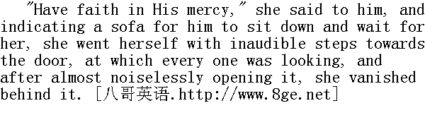 。"①她在应对他的眼神时说道, 而且行速更快地沿着走廊走去了。 ①法语: 我的朋友, 要做个大丈夫, 我准维护您的利益。 Pierre had no notion what was going on, and no inkling of what was meant by watching over his interests. But he felt that all this had had to be so. From the corridor they went into the half-lighted hall adjoining the count's reception-room. This was one of the cold, sumptuously furnished rooms which Pierre knew, leading from the visitors' staircase. But even in this apartment there was an empty bath standing in the middle of the floor, and water had been spilt on the carpet. They were met here by a servant and a church attendant with a censer, who walked on tiptoe and took no notice of them. They went into the reception-room opening into the winter garden, a room Pierre knew well, with its two Italian windows, its big bust and full-length portrait of Catherine. The same persons were all sitting almost in the same positions exchanging whispers in the reception-room. All ceased speaking and looked round at Anna Mihalovna, as she came in with her pale, tear-stained face, and at the big, stout figure of Pierre, as with downcast head he followed her submissively. 皮埃尔心里不明白是怎么回事, 他更不明白veilleravosintecits①有何涵义, 但他心里明白, 这一切理当如此。他们经过走廊走到和伯爵的接待室毗邻的半明半暗的大厅。这是皮埃尔从正门的台阶一看就知晓的冰凉的豪华卧室之一。但是, 就在这卧室的中央, 摆着一只空浴盆, 地毯上洒满了水。一名仆役和一名手捧香炉的教堂下级职员踮着脚尖向他们迎面走来, 并没有注意他们。他们走进了皮埃尔熟悉的接待室, 室内安装有两扇朝着冬季花园的意大利式窗户, 陈列着一座叶卡捷琳娜的半身大雕像和一幅她的全身画像。接待室里还是原来那些人, 差不多还是坐在原来那些位子上窃窃私语。大家都静默起来了, 回头望望走进门来的安娜?米哈伊洛夫娜, 她泪痕斑斑, 脸色苍白;也回头望望个子高大、长得肥胖的皮埃尔, 他低垂着头, 顺从地跟在安娜?米哈伊洛夫娜后面。 ①法语: 维护他的利益。 The countenance of Anna Mihalovna showed a consciousness that the crucial moment had arrived. With the air of a Petersburg lady of experience, she walked into the room even more boldly than in the morning, keeping Pierre at her side. She felt that as she was bringing the person the dying man wanted to see, she might feel secure as to her reception. With a rapid glance, scanning all the persons in the room, and observing the count's spiritual adviser, she did not precisely bow down, but seemed somehow suddenly to shrink in stature, and with a tripping amble swam up to the priest and reverentially received a blessing first from one and then from another ecclesiastic. 安娜?米哈伊洛夫娜的神色表明了, 她已经意识到紧要关头来到了。她不让皮埃尔离开她身边, 显露出彼得堡女士那种务实的风度, 步入房间, 那样子比早上显得更大胆了。她觉得, 她领着一个死在旦夕的伯爵想要见面的人, 所以, 她被接见一事是有保证的了。她向房里所有的人匆匆地瞥了一眼, 看见了伯爵的那个听取忏悔的神甫, 她没有躬起身子, 但忽然变得更矮小了。她迈着小步东歪西扭地走到神甫面前, 十分恭敬地接受一个又一个神职人员的祝福。
