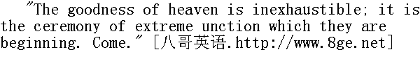 ①他于是要走了。但是皮埃尔认为, 问一问是有必要的。"身体可好么......"他踌躇起来, 不知道把行将就木的人称为伯爵是否恰当;他觉得把他称为父亲是很难为情的。 ①法语: 我的朋友, 不要气馁, 不要气馁。他吩咐人家把您喊来。这很好...... "He has had another stroke half-an-hour ago. Courage, mon ami." "Ilaeuencoreuncoup, ilyaunedemi-heure 、还发作过一次。Courage, monami..."② ②法语: 半小时前还发作过一次。......我的朋友......不要气馁...... Pierre was in a condition of such mental confusion that the word stroke aroused in his mind the idea of a blow from some heavy body. He looked in perplexity at Prince Vassily, and only later grasped that an attack of illness was called a stroke. Prince Vassily said a few words to Lorrain as he passed and went to the door on tiptoe. He could not walk easily on tiptoe, and jerked his whole person up and down in an ungainly fashion. He was followed by the eldest princess, then by the clergy and church attendants; some servants too went in at the door. Through that door a stir could be heard, and at last Anna Mihalovna, with a face still pale but resolute in the performance of duty, ran out and touching Pierre on the arm, said: 皮埃尔处于思路不清的状态中, 他一听到"中风病发作", 便把这个词想象成受到某件物体的打击。他惶惑不安地望了望瓦西里公爵, 之后才想起, 有种病叫做中风。瓦西里公爵在走路时对罗兰说了几句话, 就踮着脚尖走进门去。他不善于踮着脚尖走路, 整个身子呆笨地一耸一耸地翕动。公爵的大小姐跟在他身后, 几个神甫和教堂下级职员尾随其后, 仆人们也走进门里去。从门后可以听见物体移动的响声, 末了, 安娜?米哈伊洛夫娜跑了出来, 她的脸部仍然显得那样苍白, 但却流露着坚决履行义务的神色, 她碰碰皮埃尔的手臂, 说道: