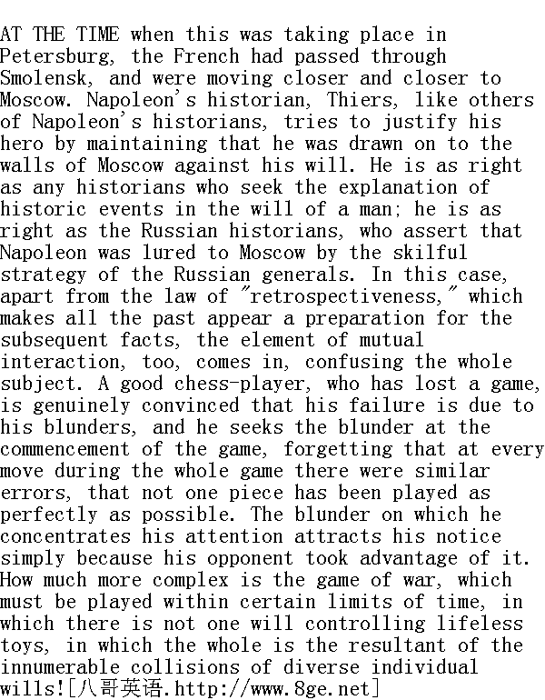 在彼得堡发生那些事情的同时, 法军已开过斯摩棱斯克, 愈来愈靠近莫斯科。拿破仑的史学家梯也尔, 像拿破仑其他史学家们一样, 竭力为自己的英雄辩护说, 拿破仑是不由自主地被引诱到莫斯科的。他像所有的历史学家一样正确(他们在一个伟人的意愿中寻求历史事件的解释), 他也像俄国史学家们一样正确(他们断言拿破仑是因俄国统帅们施巧计而诱引至莫斯科的)。在这里, 逆向(回溯)定律认为, 把过去的一切视为实现某一事件的准备过程, 但除此之外, 还有把全部事情搅浑的相互关系。一个好的棋手, 在输棋之后由衷地相信, 他的失败产生于他的一个错误, 他便在开局之初去寻找错误, 而忘记在他的每一步棋中, 在整个对弈的过程中都有错误, 以致没有一着棋是善着。他注意到的那个败着之所以被找出来, 是因为这一败着被对手利用了。在一定时间条件下进行的战争这种游戏要复杂得多, 其中不是由一个人的意愿领导着那些无生命的机器, 一切都产生于各种任意行动的无数次的冲突。 After Smolensk, Napoleon tried to force on a battle beyond Dorogobuzh, at Vyazma, and then at Tsarevo-Zaimishtche. But the Russians could not give battle, owing to innumerable combinations of circumstances, till Borodino, one hundred and twelve versts from Moscow. From Vyazma Napoleon gave instructions for an advance straight upon Moscow. 继斯摩棱斯克之后, 拿破仑先在多罗戈布日以西的维亚济马附近, 然后又在察列沃-扎伊米希附近谋求会战, 但结果呢, 由于情势的无数次冲突, 在到达波罗金罗, 离莫斯科只剩一百二十俄里处之前, 俄军仍不交战。拿破仑从维亚济马下令, 直接进军莫斯科。 "Moscow, the Asiatic capital of this great empire, the holy city of the peoples of Alexander, Moscow, with its innumerable churches in the form of Chinese pagodas!" Moscou, la capitale asiatique de ce grand emBpire, la ville sacree des peuples d'Alexandre, Moscou avec ses innombrables eglises en forme de pagodes chinoises.① ①莫斯科, 这庞大帝国的亚洲首都, 亚历山大臣民的神圣的城市, 莫斯科有数不尽的中国塔顶样式的教堂。