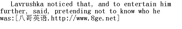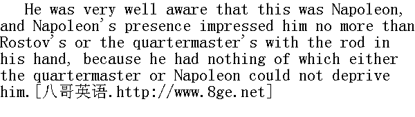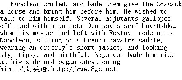拿破仑微微一笑, 他吩咐拨一匹马给哥萨克, 立即带他来见。他要亲自同他谈谈。几个副官策马前去, 一个小时后, 杰尼索夫出让给罗斯托夫的农奴拉夫鲁什卡, 穿着勤务兵的短上衣, 骑在法国骑兵的马上, 带着一张狡黠、含有醉意、快活的面孔来见拿破仑。拿破仑吩咐他和自己并辔而行开始问他。 "Are you a Cossack?"" 您是哥萨克?" "Yes; a Cossack, your honour."" 哥萨克, 大人。" "The Cossack, ignorant in whose company he was, since Napoleon's plain appearance had nothing to suggest to the Oriental imagination the presence of a monarch, talked with extraordinary familiarity of the incidents of the war," says Thiers, relating this episode. In reality Lavrushka, who had been drunk the previous evening, and had left his master without dinner, had been thrashed for it, and sent to the village in quest of fowls, where he was tempted on by plunder till he got caught by the French. Lavrushka was one of those coarse, impudent lackeys who have seen a good deal of life, look on it as a duty to do nothing without cunning and trickery, are ready to do any kind of service for their masters, and are particularly keen in scenting out the baser impulses of their superiors, especially on the side of vanity and pettiness. On coming into the presence of Napoleon, whom he easily and confidently recognised, Lavrushka was not in the least taken aback, and only did his utmost to win the favour of his new master."Le cosaque ignorant la compagnie dans laquelle il se trouvait car la simplicite de Napoleon n'avait rien qui put re veler a une imagination orientale la presence d'un souverain, s'entretint avec la plus extreme familiarite des affaires de la guerre actuelle."①梯也尔叙述这一情节说。的确, 拉夫鲁什卡头天晚上喝醉了, 没给主人准备好晚餐, 挨了鞭打后被派到乡间去买鸡, 在那里醉心于抢劫而被法军俘获。拉夫鲁什卡是那种粗野、无耻、见多识广的奴仆, 他们以下流狡猾的手段办事为其天职, 他们准备为自己的主人干任何勾当, 并且他们狡猾地推测主人的坏心思, 尤其是虚荣心和琐碎小事。落入拿破仑的人中间, 拉夫鲁什卡轻而易举地认清了拿破仑本人, 他一点也不惊惶夫措, 只是尽力打心眼里为新的老爷们效劳。 ①哥萨克不知道他现在置身于什么人中间, 因为拿破仑的简朴丝毫没有给予这个东方人的想象力以发现皇帝在场的可能, 所以, 他极其自然地讲述当前战争的形势。