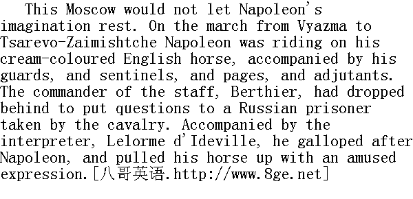这个莫斯科不让拿破仑的神思安静。拿破仑骑一匹浅栗色的截尾快马, 由近卫兵、警卫、少年侍从和副官陪同, 从维亚济马到察列沃-扎依米希。参谋长贝蒂埃留下来审问被骑兵抓到的俄军俘虏。他在翻译官Lelorme d'Ideville(勒洛涅·狄德维勒)的陪同下, 纵马追上拿破仑, 满脸高兴地勒住了马头。 "Well?" said Napoleon. "Eh bien(呃, 怎么办)?"拿破仑问。 "A Cossack of Platov's detachment says Platov is effecting a junction with the main army, and that Kutuzov has been appointed commander-in-chief. He is very shrewd and talkative." "Un cosaque de Platow(一个普拉托夫的哥萨克)说, 普拉托夫军团正同主力大军会合, 库图佐夫就任总司令。Tres in-telligent et bavard(他聪明, 不过是个饶舌的人)。