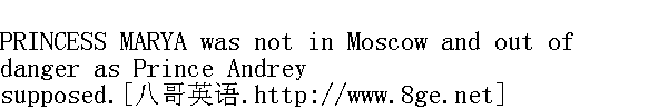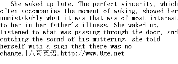 她醒得很晚, 在刚刚醒来时常有的纯净心态清楚地表明, 父亲的病已经占据了她的整个身心。她醒来之后, 在门外侧耳细听屋里的情形, 她听见他仍在呼呼哧哧, 她叹息着自言自语道, 还是那个样子。 "But what should there be? What did I hope for? I hope for his death," she cried, with inward loathing of herself." 应该是什么样子呢?我想要他怎么样呢?我想要他死去!"她怀着对自己的厌恶心情叫道。 She washed, dressed, said her prayers, and went out on to the steps. At the entrance the carriages in which their luggage was packed were standing without horses. 她穿好衣裳, 洗完脸, 念完了祈祷词, 然后走到门廓上。门廓前面停着几辆尚未套马的大车, 人们正在往车上装东西。 The morning was warm and grey. Princess Marya lingered on the steps, still horrified at her own spiritual infamy, and trying to get her ideas into shape before going in to see him. 早晨温暖、阴沉。玛丽亚公爵小姐站在门廓上, 她对自己内心的卑鄙不断地感到恐惧, 在进屋去看父亲之前, 清理了一下自己的思绪。 The doctor came downstairs and out to her. 医生下楼向她走来。