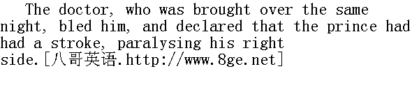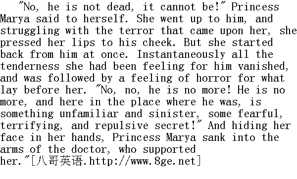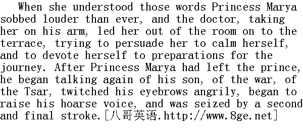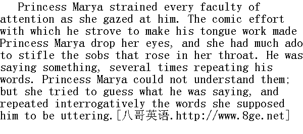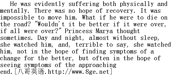 玛丽亚公爵小姐集中全部精力凝视着他。看见他使出可笑的力气转动舌头, 玛丽亚公爵小姐垂下眼帘, 勉强压制住上升到了喉咙的呜咽声。他说了一句什么话, 又重复着说了好几次。玛丽亚公爵小姐听不懂;她力图猜出他在说什么, 并且疑问地重复他发出的声音。 "O ... o ... aye ... aye ...!" he repeated several time. It was impossible to interpret these sounds. The doctor thought he had guessed it, and asked:" 嗬嗬--波依......波依......"他重复了若干次......无论怎样也不能弄明白这些话。医生以为他猜明白了这些话, 他问道 "The princess is afraid?"He shook his head, and again repeated the same sounds.: " 公爵小姐害怕吗?"他摇了摇头表示否认, 他又重复发出同样的声音。 "The soul, the soul is in pain!" Princess Marya guessed. He grunted affirmatively, took her hand, and began pressing it to different parts of his breast as though seeking the right place for it." 心里, 心里难过。"玛丽亚公爵小姐猜测着说。他肯定地发出一种含含糊糊的声音, 他抓住她的手在他胸前的各个部位按来按去, 似乎是要找到她要找到的那个部位。 "Always thinking!-about you ... thinking ...!" he articulated, far more intelligibly than before now that he felt sure of being understood. Princess Marya pressed her head against his arm, trying to hide her sobs and tears." 整个的心!都在想念你......整个的心。"然后, 他发出的声音比先前好多了, 更清楚些了, 他确信, 大家已经了解他了。玛丽亚公爵小姐把头贴在他的手上, 极力隐藏住她的呜咽声和流出来的眼泪。