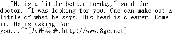 他用手抚摸着她的头发。 "I called for you all night ..." he articulated." 我整夜都在叫你......"他说。 "If I had only known ..." she said, through her tears. "I was afraid to come in."" 要是我知道......"她流着眼泪说道, "我不敢进来。" He pressed her hand. 他握着她的手。 "Weren't you asleep?"" 你没有睡吗?"