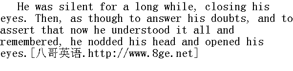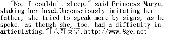 没有, 我没有睡。"玛丽亚公爵小姐否定地摇了摇头说道, 她不由自主地顺从着父亲, 依照着他的样子, 说话时尽量比划着手势, 好像是她的舌头转动起来也很困难。 "Darling!" ... or "dear one!" ... Princess Marya could not distinguish the word; but from the expression of his eyes she had no doubt what was said was a word of caressing tenderness such as he had never used to her before. "Why didn't you come?"" 亲爱的......"或许是说: "好孩子......"玛丽亚公爵小姐弄不清楚他所说的话, 不过从他眼神的表情来看, 他大概是说了一句他从来都没有说过的温情的、爱抚的话。"为什么不进来呢?" "And I was wishing, wishing for his death!" thought Princess Marya." 而我希望, 希望他死去!"玛丽亚公爵小姐想到。他 He paused. 沉默了一会儿。 "Thanks ... to you ... child, dear one! for all, for all ... forgive ... thanks! ... forgive! ... thanks! ..." And tears flowed from his eyes. "Call Andryusha," he said suddenly, and a look of childish and deprecating misgiving came into his face at the question. He seemed to be himself aware that his question had no meaning. So at least it seemed to Princess Marya." 谢谢你......女儿, 好孩子......为了一切, 为了一切, 谢谢......原谅......谢谢, 原谅......谢谢!......"泪水夺眶而出。"去把安德留沙叫来。"他突然说, 一说出这句话, 他脸上表露出孩子般的怯生生的和怀疑的神情。他自亡似乎也知道, 他这个要求是没有意义的。至少玛丽亚公爵小姐觉得是这样。