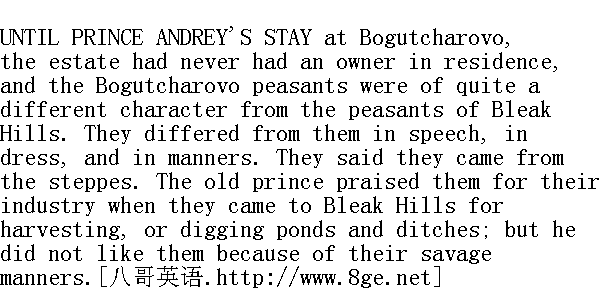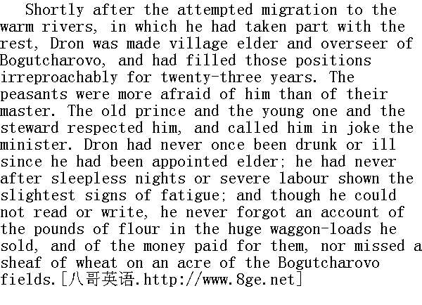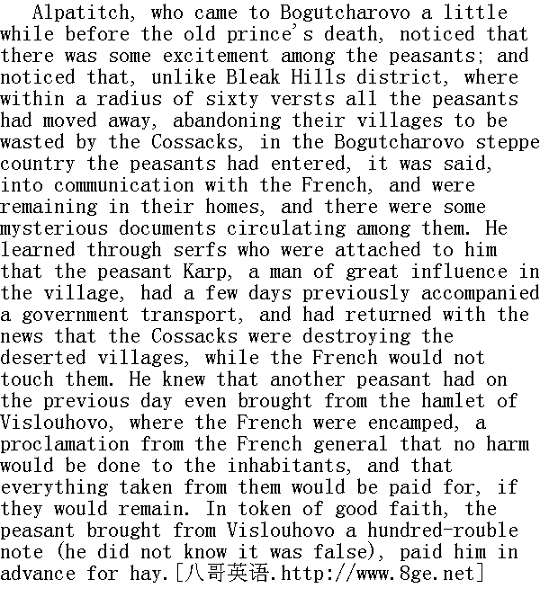 在安德烈公爵没有来博古恰罗沃之前, 这里是主人从未来过的庄园, 博古恰罗沃的农夫与童山的农夫性格迥然不同, 他们在口音、衣着、习俗等方面都与童山的农夫不同。他们被称为草原农民。以往他们到童山帮助收割庄稼和挖掘池塘沟渠时, 老公爵赞赏他们能吃苦耐劳, 但是不喜欢他们的那种野性。 Prince Andrey's residence at Bogutcharovo, and his innovations-his hospitals and schools and the lowering of their rent-had not softened their manners, but, on the contrary, had intensified their traits of character, which the old prince called their savagery.Obscure rumours were always current among them: at one time a belief that they were all to be carried off to be made Cossacks, then that they were to be converted to some new religion, then rumours of some supposed proclamations of the Tsar, or of the oath to the Tsar Pavel Petrovitch in 1797 (which was said to have granted freedom to the peasants, and to have been withdrawn by the gentry later); then of the expected return of the Tsar Peter Fedorovitch, who was to rise again from the dead in seven years, and to bring perfect freedom, and to make an end of the existing order of things. Rumours of the war, and Bonaparte and his invasion, were connected in their minds with vague conceptions of Antichrist, of the end of the world, and perfect freedom. 安德烈公爵在这一次来博古恰罗沃之前不久, 曾来这里住过一段时间, 他创办了一些新设施--医院、学校和减轻免役税①, 等等, 这一切并未能略微改变他们的习俗, 而且相反, 更加强了他们那些被老公爵称之为野性的性格特点。在他们中间经常流传着一些含含混混的谣言, 时而传说要把他们全都编入哥萨克, 时而传说要他们改信一种新的宗教, 时而传说沙皇颁布了什么告示, 时而传说一七九七年保罗·彼得罗维奇的誓词(关于这一誓词的传说是, 已经赐给他们自由, 但是被地主们剥夺了), 时而传说彼得·费奥多罗维奇②过七年要复位, 那时一切都很自由, 一切都很简单, 什么麻烦事情都不会再有了。关于战争和波拿巴, 以及他入侵的传闻, 在他们的头脑中, 跟基督的敌人、世界末日和绝对自由等模糊观念混在一起。 ①封建时代为免劳役所交纳的赋税。 ②彼得三世皇帝, 在一七六二年其妻叶卡捷琳娜二世即位的时候, 被刺杀或病死了;但是沙皇在农民的头脑中是永生的, 他们不相信沙皇会死去。 In the vicinity of Bogutcharovo were large villages inhabited by Crown serfs, or peasants who paid rent to absentee owners. There were very few resident landowners in the neighbourhood, and consequently very few house-serfs or peasants able to read and write. And among the peasants of that part of the country there could be seen more distinctly and strongly marked than among others those mysterious undercurrents in the life of the Russian peasantry, which are so baffling to contemporaries. Twenty years before, there had been a movement among the peasants of the district to emigrate to certain supposedly warm rivers. Hundreds of peasants, among them those of Bogutcharovo, had suddenly begun selling their cattle and moving away with their families towards the south-west. Like birds flying to unknown realms over the ocean, these men with their wives and children turned towards the south-west, where no one of them had been. They set off in caravans, redeemed their freedom one by one, ran and drove and walked to the unknown region of the warm springs. Many were punished; some sent to Siberia; many died of cold and hunger on the road; many came back of their own accord; and the movement died down as it had begun without obvious cause. But the undercurrents still flowed among the people, and were gathering force for some new manifestation, destined to appear as strangely, unexpectedly, and at the same time simply, naturally, and forcibly. In 1812 any one living in close relations with the peasants might have observed that there was a violent ferment working below the surface, and an outbreak of some kind was at hand. 博古恰罗沃附近所有大村庄都是属于皇家和收免役税的地主。在这一地区居住生活的地主非常之少, 家奴和识字的农奴也很少, 在这一地区农民的生活中, 俄罗斯人民生活中神秘的潜流比其他地方表现得更加明显和更为有力。当代人对这些潜流的原因和意义十分费解。二十年前在这一地区的农民中间曾经发生过向着某某温暖的河流迁徙的运动, 这就是这些潜流的表现之一。成百上千的农民, 其中就有博古恰罗沃人, 他们忽然卖掉牲口, 携全家老小向着东南方向的某个地方走去。好像一群鸟飞向海外某个地方一样, 这些人携带着老婆孩子向着东南方向飞奔, 而要去的这个地方, 他们当中没有一个人曾经去过。他们成群结队出发, 一个一个地赎回他们的自由, 有的逃跑出来, 他们坐车的坐车, 步行的步行, 朝着温暖的河流走去。很多人遭到惩罚, 有的被流放到西伯利亚, 有些人在路上被冻死和饿死。很多人又自己转身回来, 这一场运动就像其一开头那样, 看不出其中有什么明显的原因, 就自然而然地平息下去了。但是, 这股潜流在这些人中间并没有停止, 而且还在积聚着新的力量, 一旦爆发, 依然是那么奇特, 那么突然, 同时又那么简单, 自然, 有力。现在, 一八一二年, 每一个和这帮人接近的人都能看得出, 这股潜流正在加紧活动, 离爆发的日子已为期不远了。