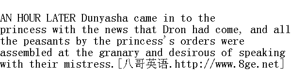 在这之后过了一个钟头, 杜尼亚莎前来向公爵小姐报告一则消息: 德龙来了, 按照小姐的吩咐农夫们都集合在谷仓旁, 有事要跟女主人商谈。 "But I did not send for them," said Princess Marya. "I merely told Dronushka to give them the corn."" 是吗?我并没叫他们来, "玛丽亚公爵小姐说, "我只是叫德龙努什卡把粮食分给他们。" "Only, for God's sake, your excellency, order them to be sent away and don't go to them. It's all a plot," said Dunyasha, "and Yakov Alpatitch will come and we will start ... and pray ..."" 看在上帝的份上, 亲爱的公爵小姐, 叫人把他们赶走吧, 决不要到他们那儿去。那不过是个圈套, "杜尼亚莎说, "等雅科夫·阿尔帕特奇他们回来, 我们就走......您千万别......" "How a plot?" asked the princess in surprise." 什么圈套?"公爵小姐惊讶地问。 "Why, I know all about it, only do listen to me, for God's sake. Ask old nurse too. They say they won't agree to move away at your orders."" 我确实知道, 看在上帝的份上, 可得听我说。您只要问问保姆就知道了。听说他们都不愿按照您的吩咐离开村子。"