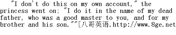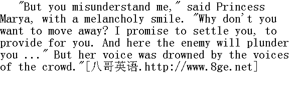 我这样做, 不仅是我个人的心意, "公爵小姐接着说, "我这样做是代表我辞世的父亲, 你们的好主人, 还代表我的哥哥和他的儿子。" She paused again. No one broke the silence. 她又停住了, 没有人打破这种沉默。 "We have trouble in common, and we will share it all equally. All that is mine is yours," she said, looking up at the faces before her. All the eyes were gazing at her with the same expression, the meaning of which she could not fathom. Whether it were curiosity, devotion, gratitude, or apprehension, and distrust, the expression on all the faces was alike." 我们的不幸是共同的, 让我们一起分担这个不幸吧。我的一切, 也是你们的一切。"她说完, 扫视了一下站在她面前的人群的面孔。所有的眼睛都以同样的表情望着她, 她不能明白这种表情的含义。不知道是好奇、忠诚、感激, 还是惊慌或不信任, 只是所有脸上的表情都是相同的。 "Very thankful for your kindness, only it's not for us to take the master's corn," said a voice from the back." 对于您的恩典, 我们非常感激, 不过, 我们不能拿地主的粮食。"后面传来这样一句话。 "But why not?" said the princess. No one answered, and Princess Marya, looking up at the crowd, noticed that now all the eyes dropped at once on meeting hers." 为什么呢?"公爵小姐问。没有人回答, 玛丽亚公爵小姐环视人群, 发现现在所有的眼睛一碰到她的目光, 就立刻垂下了。
