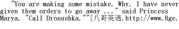 你扯到哪儿去了。我从来没有吩咐他们离开村子......"玛丽亚公爵小姐说, "把德龙努什卡叫来。 Dron on coming in confirmed Dunyasha's words; the peasants had come by the princess's instructions." 德龙来了, 他证实了杜尼亚莎说的话;农民是按照公爵小姐的吩咐来的。 "But I have never sent for them," said the princess. "You must have given them my message wrong. I only said that you were to give them the corn."" 可是我从来没有召集他们, "公爵小姐说, "你大概把话传错了。我只是叫你把粮食分给他们。" Dron sighed without replying. 德龙没有回答, 叹了一口气。 "If so you command, they will go away," he said." 您只要下个命令, 他们就会四散的。"他说。