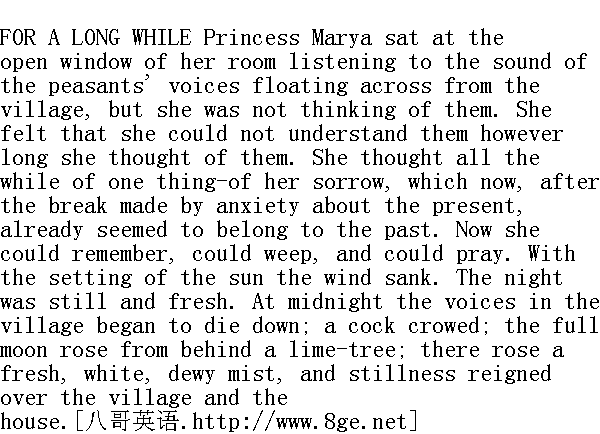 这天夜晚, 玛丽亚公爵小姐在她卧室敞开的窗房坐了很久, 留心地听从村里传来的农民的说话声, 但她不去想他们。她觉得她无论怎样想他们, 也不能理解他们。她总在思忖一件事--那就是自己的不幸, 在经过那关心现实生活的一段时间之后, 这种不幸, 对于她已成往事。她现在能够回忆, 能够哭泣, 也能祈祷了。日落后, 风停了, 夜显得宁静而清新。十二点时人声渐渐消失, 鸡叫头遍, 从菩提树后面升起一轮满月, 清凉的、乳白色的浓雾弥漫开来, 寂静笼罩着村庄和宅院。 One after another pictures of the immediate past-her father's illness and last moments-rose before her imagination. And with mournful gladness she let her mind now rest on those images, only shunning with horror the one last scene which she felt she had not the strength to contemplate even in fancy at that still and mysterious hour of the night. And those images rose with such clearness and in such detail before her, that they seemed to her now in the actual present, now in the past, and now in the future. 不久前过去的图景--父亲的病和临终的时刻, 一幅接一幅在她的脑海里闪现。现在她带着快乐的忧郁细细回味这些画面的形象, 只是恐惧地摒除最后父亲死亡时的景象。这景象, 她觉得, 在这寂静、神秘的夜晚, 即便浮光掠影地想象一下, 她也没有勇气。这些图景在她的脑海里是那么清晰, 连微小的细节都历历在目, 她觉得这些图景忽而是现实的, 忽而是过去的, 忽而又是未来的。 She had a vivid picture of the moment when he was first stricken down and was being dragged in from the garden at Bleak Hills, and he had muttered something, twitching his grey eyebrows, and looking timidly and uneasily at her. "Even then he wanted to tell me what he told me on the day of his death," she thought. "He always thought what he told me then." 她时而生动地想起他中风的情景, 人们搀扶着他从童山的花园里出来, 他用无力的舌头咕噜着什么, 扭动着白眉毛, 不安地、胆怯地望着她。"他当时就想说他临死那天对我说的话, "她想, "他经常在想他对我说的话。" And then she recalled with every detail the night at Bleak Hills before his stroke, when, with a presentiment of trouble, she had remained with him against his will. She had not slept; and at night she had stolen down on tip-toe, and going to the door of the conservatory room where her father was spending that night, she had listened to his voice. He was talking in a weary, harassed voice to Tihon. He was saying something about the Crimea, about the warm nights, about the Empress. Evidently he wanted to talk to some one. "And why didn't he send for me? Why didn't he let me be there in Tihon's place?" Princess Marya had thought then and thought again now. "Now he will never tell any one all that was in his heart. Now the moment will never return when he might have told me all he longed to express, and I and not Tihon might have heard and understood. Why didn't I go into his room then?" she thought. "Perhaps he would have said to me then what he said on the day of his death. Even then talking to Tihon he asked about me twice. He was longing to see me while I was standing there behind the door. He was sad and weary talking to Tihon, who did not understand him. I remember how he spoke to him of Liza as though she were living-he forgot that she was dead, and Tihon reminded him that she was no more, and he cried, 'Fool!' He was miserable. I heard from the door how he lay down groaning on the bed and cried out aloud, 'My God!' Why didn't I go in then? What could he have done to me? What could I have lost? And, perhaps, then he would have been comforted, he would have said that word to me." And Princess Marya uttered aloud that caressing word he had said to her on the day of his death. "Da-ar-ling!" Princess Marya repeated the word and broke into sobs that relieved her heart. She could see his face before her now. And not the face she had known ever since she could remember and had always seen at a distance; but the weak and timid face she had seen on the last day when, bending to his lips to catch what he said, she had, for the first time, looked at it quite close with all its wrinkles. 于是她回忆起他在童山中风的前一天夜里一切详细的情景, 当时玛丽亚公爵小姐就预感到有灾祸临头, 也因此违反他的旨意留在他身边。她没有就寝, 夜里蹑手蹑脚下楼梯, 来到她父亲过夜的花房门前, 侧耳倾听他的声音。他和吉洪在说什么, 他的声音疲惫不堪而且痛楚。看来他很想和人谈谈话。"他为什么不叫我呢?为什么他不让我和吉洪换个位置呢?"玛丽亚公爵小姐当时和现在都是这样想的。"他永远对任何人也说不出他的心里话了。他本来可以说出他要说的话的, 本来应该是我, 而不是吉洪听到和懂得他的话的, 但是这样的机会, 无论是对他还是对我都一去不复返了。当时为什么我不走进屋里去呢?"她想, "也许他当时就会对我说出他在去世那天要说的话。而且当时他在和吉洪的谈话中就有两次问到我。他希望看见我, 而我却站在门外。他和不了解他的吉洪谈话是很感伤、难受的, 记得他们谈话时提到丽莎, 仿佛她还活着似的, 他忘记她已经死了, 吉洪提醒他说, 丽莎已经去世了, 于是他大声喝斥: '傻瓜!''他是很痛苦的。隔着门我听见他躺在床上的呻吟声并高声喊叫: '上帝啊!'当时我为什么不进去呢?他能把我怎样?我能有什么损失呢?我进去了, 也许当时他就能得到慰藉并对我说出那句话了。"于是玛丽亚公爵小姐大声地叫出了他临死那天对她说的那个亲切的字眼。"亲-爱-的!"她重复着这个字眼, 放声大哭起来, 流着眼泪, 眼