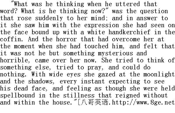 他说这话时, 在想什么呢?他现在在想什么呢?"她的脑海里忽然出现这个问题, 紧接着, 作为应答的是, 她的眼前闪现了他在棺材里用白手巾包着头的面部表情。于是一阵恐惧向她袭来, 这正是当天刚一接触他, 就认为这不仅不是他, 而且是一种神秘的、令人反感的东西的那种恐惧。她想思索点别的, 想祈祷, 但什么也做不成。她睁大眼睛望着月光和阴影, 随时等待着看见他那死人的面孔。她觉得, 笼罩着住宅内外的寂静气氛紧紧箝制着她。 "Dunyasha!" she whispered. "Dunyasha!" she shrieked wildly, and tearing herself out of the stillness, she ran towards the maids' room, meeting the old nurse and the maids running out to meet her." 杜尼亚莎!"她喃喃地说, "杜尼亚莎!"她狂叫一声, 挣脱出一片寂静, 跑向女仆的住室, 迎面碰上向她跑来的保姆和女仆们。
