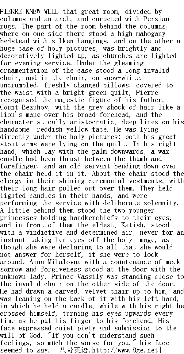 这个大房间皮埃尔了若指掌, 几根圆柱和一道拱门把它隔开来了, 四面墙上挂满了波斯壁毯。房间里的圆柱后面, 一方摆着一张挂有帷幔的高高的红木卧榻, 另一方陈设着一个大神龛, 像晚祷时的教堂一般, 房间的这一部分灯火明亮, 红光四射。神龛的灿烂辉煌的金属衣饰底下, 放着一张伏尔泰椅, 上面摆着几个雪白的、尚未揉皱的、显然是刚刚换上的枕头, 皮埃尔所熟悉的他父亲别祖霍夫伯爵的端庄的身躯就躺在这张伏尔泰椅上, 一床鲜绿色的被子盖在他腰上, 在那宽大的额头上还露出狮子鬃毛般的白发, 在那俊美的橙红色的脸上, 仍旧刻有高贵者特有的深深的皱纹。他直挺挺地躺在神像下方, 两只肥大的手从被底下伸出来, 放在它上面。右手手掌向下, 大拇指和食指之间插着一根蜡烛, 一名老仆从伏尔泰椅后面弯下腰去, 用手扶着那根蜡烛。几个神职人员高高地站在伏尔泰椅前面, 他们身穿闪闪发光的衣裳, 衣裳外面露出了长长的头发, 他们手里执着点燃的蜡烛, 缓慢地、庄严地做着祷告。两个年纪较小的公爵小姐站在神职人员身后不远的地方, 用手绢捂着眼角边, 公爵的大小姐卡季什站在她们前面, 她现出凶恶而坚定的神态。目不转睛地望着神像, 好像在对众人说, 如果她一环顾, 她就没法控制自己。安娜?米哈伊洛夫娜脸上流露着温顺的忧愁和大度包容的神色, 她和一个不认识的女士伫立在门旁。这扇门的另一边, 靠近伏尔泰椅的地方, 瓦西里公爵站在雕花的天鹅绒面交椅后面, 他把椅背向自己身边转过来, 左手执着一根蜡烛撑在椅背上, 每次当地用手指碰到额角时, 他就抬起眼睛, 一面用右手画十字。他的脸上呈露着心安理得的虔诚和对上帝意志的无限忠诚。"假若你们不明白这种感情, 那末你们就更糟了。"他那神色仿佛说出了这番话。一名副官、数名大夫和一名男仆站在瓦西里公爵后面, 俨如在教堂里那样, 男人和女人分立于两旁。大家都沉默不言, 用手画着十字, 只听见琅琅祈祷声、圆浑而低沉的唱诗声以及静默时移动足步的响声和叹息声。安娜?米哈伊洛夫娜现出威风凛凛的样子, 表示她知道应该怎样行事, 她于是穿过房间走到皮埃尔身边, 把一支蜡烛递给他。他把蜡烛点燃了, 因为他乐于观察周围的人而忘乎所以, 竟然用那只拿过蜡烛的手画起十字来。 Behind him stood the adjutant, the doctors, and the men-servants; the men and the women had separated as though they were in church. All were silently crossing themselves, nothing was audible but the reading of the service, the subdued, deep bass singing, and in the intervals of silence sighs could be heard and the shuffling of feet. With a significant air, which showed she knew what she was about, Anna Mihalovna walked right across the room to Pierre and gave him a candle. He lighted it, and absorbed in watching the people around him, he absent-mindedly crossed himself with the hand in which he held the candle. The youngest princess, Sophie, the rosy, laughing one with the mole, was looking at him. She smiled, hid her face in her handkerchief, and for a long while did not uncover it. But looking at Pierre again, again she laughed. She was apparently unable to look at him without laughing, but could not resist looking at him, and to be out of temptation, she softly moved behind a column. In the middle of the service the voices of the priests suddenly ceased, and they whispered something to one another. The old servant, who was holding the count's hand, got up and turned to the ladies. Anna Mihalovna stepped forward and, stooping over the sick man, she beckoned behind her back to Lorrain. The French doctor had been leaning against the column without a candle, in the respectful attitude of the foreigner, who would show that in spite of the difference of religion he comprehends all the solemnity of the ceremony and even approves of it. With the noiseless steps of a man in full vigour of his age, he went up to the sick man. His delicate, white fingers lifted his disengaged hand from the quilt, and turning away, the doctor began feeling the pulse in absorbed attention. They gave the sick man some drink; there was a slight bustle around him, then all went back to their places and the service was continued. During this break in the proceedings Pierre noticed that Prince Vassily moved away from his chair-back, and with that same air of being quite sure of what he was about, and of its being so much the worse for others, if they failed to understand it, he did not go up to the sick man, but passed by him and joined the eldest princess. Then together they went away to the further end of the room to the high bedstead under the silk canopy. When they moved away from the bed the prince and princess disappeared together by the further door, but before the end of the service they returned one after the other to their places. Pierre paid no more attention to this circumstance than to all the rest, having once for all made up his mind that all that he saw taking place that evening must inevitably be as it was. 最年幼的长有一颗胎痣的公爵小姐索菲, 两颊粉红, 含着笑意, 正在打量着皮埃尔。她微微一笑, 把脸蛋藏进手绢里, 久久地不肯把它露出来。但是她望了望皮埃尔, 又笑了起来。显然, 她觉得看见他就会发笑, 但却忍不住, 还是会看他, 为避免引诱, 她悄悄地窜到圆柱后面去了。在祈祷的半中间, 神职人员的声音骤然停止了, 但有几个神甫轻声地交谈了三言两语, 一名老仆握着伯爵的手, 站起身来, 向女士们转过脸去。安娜?米哈伊洛夫娜向前走去, 在病人前面弯下腰来, 从背后用指头把罗兰招呼过来