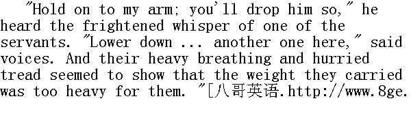 抓住我的手, 那样会摔下去的, "他听见一个仆役的惊恐的低语声, "从下面托住......再来一个人, "几个人都开腔说话, 人们喘着粗气的声音和移动脚步的声音显得更加急促了, 好像他们扛的重东西是他们力所不能及的。 As they passed him-Anna Mihalovna among them-the young man caught a glimpse over people's backs and necks of the great muscular open chest, the grey, curly, leonine head, and the massive shoulders of the sick man, which were pushed up, as he was supported under the armpits. His head, with its extraordinarily broad brow and cheek-bones, its beautiful sensual mouth, and haughty, cold eyes, was not disfigured by the proximity of death. It was just the same as Pierre had seen it three months before, when his father had been sending him off to Petersburg. But the head swayed helplessly with the jerky steps of the bearers, and the cold, apathetic eyes did not know on what to rest. 扛起伯爵的人们, 其中包括安娜?米哈伊洛夫娜在内, 都赶上年轻的皮埃尔, 走到他身边了, 从人们的背脊和后脑勺后面, 他隐约地看见病人又高又胖的裸露的胸膛, 因被人搀起两腋而略微向上翘起的胖乎乎的肩膀和长满卷曲白发的狮子般的头。他的前额和颧骨非常宽阔, 嘴长得俊美而富于肉感, 目光威严而冷漠。这个头并未因濒临死亡而变得难看, 和三个月以前伯爵打发皮埃尔去彼得堡时一模一样。但是, 这个头竟因扛起伯爵的人脚步不均匀而显得软弱无力, 微微地摇晃, 他那冷漠的目光真不知要停留在什么上面。 They were busy for several minutes round the high bed; then the people, who had moved the count, dispersed. Anna Mihalovna touched Pierre's arm and said, "Come along." With her Pierre approached the bed, on which the sick man had been laid in a ceremonial position in keeping with the sacred rite that had just been performed. He was lying with his head propped high on the pillows. His hands were laid symmetrically on the green silk quilt with the palms turned downwards. When Pierre came up, the count looked straight at him, but he looked at him with a gaze the intent and significance of which no man could fathom. Either these eyes said nothing, but simply looked because as eyes they must look at something, or they said too much. Pierre stopped, not knowing what he was to do, and looked inquiringly at his monitress. Anna Mihalovna gave him a hurried glance, with a gesture indicating the sick man's hand and with her lips wafting towards it a phantom kiss. Pierre did as he was bid, and carefully craning his neck to avoid entanglement with the quilt, kissed the broad-boned, muscular hand. There was not the faintest stir in the hand, nor in any muscle of the count's face. Pierre again looked inquiringly at Anna Mihalovna to learn what he was to do now. Anna Mihalovna glanced towards the armchair that stood beside the bed. Pierre proceeded obediently to sit down there, his eyes still inquiring whether he had done the right thing. Anna Mihalovna nodded approvingly. Again Pierre fell into the na?vely symmetrical pose of an Egyptian statue, obviously distressed that his ungainly person took up so much room, and doing his utmost to look as small as possible. He looked at the count. The count still gazed at the spot where Pierre's face had been, when he was standing up. Anna Mihalovna's attitude evinced her consciousness of the touching gravity of this last meeting between father and son. It lasted for two minutes, which seemed to Pierre an hour. Suddenly a shudder passed over the thick muscles and furrows of the count's face. The shudder grew more intense; the beautiful mouth was contorted (it was only then that Pierre grasped how near death his father was) and from the contorted mouth there came a husky, muffled sound. Anna Mihalovna looked intently at the sick man's mouth, and trying to guess what he wanted, pointed first to Pierre, then to some drink, then in an inquiring whisper she mentioned the name of Prince Vassily, then pointed to the quilt. The eyes and face of the sick man showed impatience. He made an effort to glance at the servant, who never moved away from the head of his bed. 扛过病人的人们在那高高的卧榻周围忙碌几分钟以后, 就各自散开了。安娜?米哈伊洛夫娜碰了碰皮埃尔的手, 对他说: "venez."①皮埃尔和她一道走到卧榻前面, 病人安放在卧榻之上, 那姿态逍遥自在, 这显然是和方才施圣礼有关系。他躺着, 头部高高地靠在睡枕上, 掌心向下, 两手平衡地搁在绿色丝绸被子上。当皮埃尔走到近旁, 伯爵的目光直直地射在他身上, 但是没有人能够了解他那目光表露什么意义, 也许它根本没有含义, 只是因为他还有一双眼睛, 他就要朝个方向随便看看罢了, 也许这目光表明了太多的心事。皮埃尔停步了, 不知道该做什么好, 他用疑问的目光看了看他的带路人安娜?米哈伊洛夫娜。安娜?米哈伊洛夫娜赶快使个眼色向他示意, 同时用手指着病人的手, 用嘴唇向它送了个飞吻。皮埃尔极力地把颈子伸长, 以免碰到伯爵的丝绸被子, 又用嘴唇吻吻他那骨胳大的肥厚的手, 履行了她的忠告。无论是伯爵的手, 还是他脸上的筋肉都不会颤动了。皮埃尔又疑问地望了望安娜?米哈伊洛夫娜, 向她发问, 他现在该做什么事。安娜?米哈伊洛夫娜向他使个眼色, 心中意指着卧榻旁边的安乐椅。皮埃尔在安乐椅上温顺地坐下来, 继续用目光询问, 他做得是否恰到好处。安娜?米哈伊洛夫娜点点头, 表示称赞。皮埃尔又做出一副埃及雕像那种恰如其分的稚气的姿势, 显然, 他因为自己那粗笨肥大的身体占据太大的空间而倍觉遗憾, 才煞费苦心尽量使自己缩得小一点。他两眼望着伯爵。伯爵还在端详着皮埃尔站立