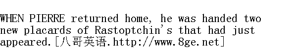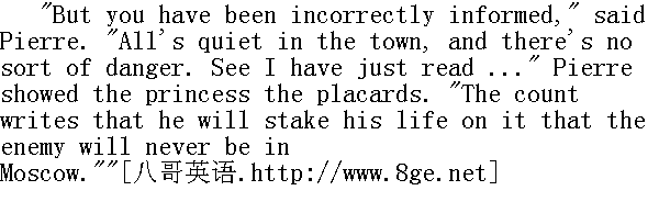 皮埃尔回到家里, 仆人交给他当天取来的两张拉斯托普钦的传单。 The first declared that the rumour, that it was forbidden to leave Moscow by Count Rastoptchin's order, was false, and that, on the contrary, he was glad that ladies and merchants' wives were leaving the town. "There will be less panic and less false news," said the notice; "but I will stake my life on it that the miscreant will never enter Moscow." 第一张传单说, 谣传拉斯托普钦伯爵禁止人们离开莫斯科--不真实。与之相反, 太太小姐和商人的妻子离开莫斯科, 使拉斯托普钦伯爵感到高兴。"可以少点恐惧, 少点传闻, "传单上说, "但是我以生命担保, 那个凶手决到不了莫斯科。" These words first showed Pierre clearly that the French certainly would enter Moscow. In the second placard it was announced that our headquarters were at Vyazma, that Count Wittgenstein had defeated the French, but that since many of the inhabitants of Moscow were desirous of arming themselves, weapons had been provided to meet their wishes in the arsenal; swords, pistols, and guns could all be procured there at a low rate.The tone of this notice was not as jocose as the former supposed discourses of Tchigirin. The two placards made Pierre ponder. It was evident to him that the menacing storm cloud, for the advent of which his whole soul longed, though it roused an involuntary thrill of horror, it was evident that that cloud was coming closer. 这句话使皮埃尔第一次清楚地看出, 法国人一定要到莫斯科。第二份传单是说我们的大本营在维亚济吗, 维特根施泰因伯爵打败了法国人, 因为许多居民愿意武装起来, 所以武器库为他们准备了武器: 军刀、手枪、长枪。这些武器将廉价地卖给他们。传单的口吻已不像原先在奇吉林谈话中那样诙谐了。面对这些传单, 皮埃尔沉思起来。显然一场可怕的、孕育着暴风雨的乌云--他曾经以全部灵魂的力量呼唤, 同时使他不由自主地恐惧的乌云, 已经临近了。 "Shall I enter the service and join the army or wait here?" Pierre thought, a question he had put to himself a hundred times already. He took up a pack of cards that lay on the table to deal them for a game of patience." 我是去参军, 到部队去呢, 还是再等一等?"他第一百次向自己提出这个问题。他从桌上拿起一副牌, 开始摆起纸牌卦来。 "If I succeed in this game of patience," he said to himself, shuffling the pack as he held it in his hand and looked upwards; "if I succeed, it means ... what does it mean?" ... He had not time to decide this question when he heard at the door of his study the voice of the eldest princess, asking whether she might come in. "Then it will mean that I must set off to join the army," Pierre told himself. "Come, come in," he said to the princess." 假如卦猜开了, "他洗好牌, 把牌拿在手里, 眼睛往上望着, 自言自语道: "假如成功, 那就是说......说什么呢?"他还未来得及决定应该说什么的时候, 书斋门外传来大公爵小姐的声音, 她问可不可以进来。"那就是说, 我应该去参军。"他对自己说。"进来, 进来。"