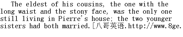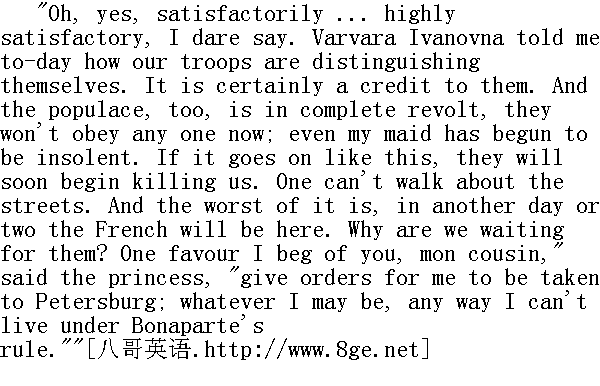 他把脸转向公爵小姐, 补充说。(只有这个最大的公爵小姐, 就是那个腰肢长长的, 面孔板板的公爵小姐, 还住在皮埃尔家里, 另外两个小的都出嫁了。) "Excuse my coming to you, cousin," she said in a tone of reproach and excitement. "Some decision really must be come to, you know. What is going to happen? Every one has left Moscow, and the populace are becoming unruly. Why are we staying on?"" 请原谅, mon cousine①, 我来找您。"她用责备的、激动的口气说。"终究要想个办法才行!老是这样算怎么回事呀?大家都离开莫斯科了, 老百姓在闹事。我们留下来作什么呀?" ①法语: 表弟。 "On the contrary, everything seems going on satisfactorily, ma cousine," said Pierre in the habitually playful tone he had adopted with his cousin, to carry off the embarrassment he always felt at being in the position of a benefactor to her." 正好相反, 看来一切顺利, ma cousine①, "皮埃尔带着开玩笑的语气说, 皮埃尔对充当她的恩人这个角色, 总觉得过意不去, 所以习惯用这种态度跟她说话。 ①法语: 表姐。