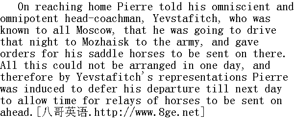 一回到家, 皮埃尔就吩咐他那无所不知、无所不能、闻名全莫斯科的车夫叶夫斯塔菲耶维奇, 把他的几匹鞍马送到莫扎伊斯克, 他当夜就要到那儿去参军。这件事不可能当天就安排好, 依叶夫斯塔菲耶维奇的意思, 皮埃尔的行期得推迟到第二天, 好有时间把替换的马赶到路上。 The 24th was a bright day after a spell of bad weather, and after dinner on that day Pierre set out from Moscow. Changing horses in the night at Perhushkovo, Pierre learned that a great battle had been fought that evening. He was told that the earth had been vibrating there at Perhushkovo from the cannon. No one could answer Pierre's question whether the battle was a victory or a defeat. This was the battle of the 24th at Shevardino. Towards dawn Pierre approached Mozhaisk.Troops were quartered in all the houses in Mozhaisk, and at the inn, where Pierre was met by his coachman and postillion, there was not a room to spare; the whole place was full of officers. 二十四日, 阴雨过后, 天转晴。午饭后皮埃尔离开莫斯科。当夜在佩尔胡什科夫换马的时候, 皮埃尔听说那天傍晚打了一场大仗。人们都在讲, 佩尔胡什科夫的地面都被炮声震得打颤。皮埃尔问谁打赢了。没有人能回答。(这是二十四日舍瓦尔金诺村战役。)翌日拂晓, 皮埃尔到达莫扎伊斯克。 From Mozhaisk onwards troops were halting or marching everywhere. Cossacks, foot soldiers, horse soldiers, waggons, gun-carriages, and cannons were everywhere. 莫扎伊斯克所有的房屋都驻有士兵, 皮埃尔的马夫和车夫都在这里的客店迎接他, 客店已没有空房间了, 都住满了军官。 Pierre pushed on as fast as possible, and the further he got and the more deeply he plunged into this ocean of soldiers, the stronger became the thrill of uneasiness and of a new pleasurable sensation. It was a feeling akin to what he had felt at the Slobodsky Palace on the Tsar's visit, a sense of the urgent necessity of taking some step and making some sacrifice. He was conscious now of a glad sense that all that constitutes the happiness of life, comfort, wealth, even life itself, were all dust and ashes, which it was a joy to fling away in comparison with something else. ... What that something else was Pierre could not have said, and indeed he did not seek to get a clear idea, for whose sake and for what object he found such peculiar joy in sacrificing all. He was not interested in knowing the object of the sacrifice, but the sacrifice itself afforded him a new joyful sensation. 莫扎伊斯克城里城外都有军队驻扎和通过。到处可以见到哥萨克、步兵、骑兵、大车、炮弹箱和大炮。皮埃尔急急忙忙向前赶路, 他离莫斯科越远、越深入这士兵的海洋, 就越感到焦急不安, 同时有一种还没有体验过的新鲜的喜悦之情。这是一种类似他在斯洛博达宫当国王驾到时所体验的, 一种必须做点什么或牺牲点什么的感觉。他现在愉快地感觉到, 构成人们的幸福的一切--生活的舒适、财富, 甚至生命本身, 比起某种东西来, 都是弃之为快的虚妄的东西......比起什么东西呢?皮埃尔弄不清楚, 也不想极力去弄清楚为了何人, 为了何事而牺牲一切才使他认为特别美好。他对自己为之而牺牲的东西并不感兴趣, 只是牺牲本身对他来说是一种新鲜的、快乐的感觉。