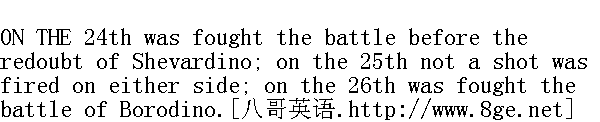 史书上是这样记载的, 而这是完全歪曲的, 这一点, 任何愿意深入研究事情真相的人, 都能很容易弄清楚。 The Russians did not seek out the best position; on the contrary, on their retreat they had passed by many positions better than Borodino. They did not make a stand at one of these positions, because Kutuzov did not care to take up a position he had not himself selected, because the popular clamour for a battle had not yet been so strongly expressed, because Miloradovitch had not yet arrived with reinforcements of militia, and for countless other reasons.The fact remains that there were stronger positions on the road the Russian army had passed along, and that the plain of Borodino, on which the battle was fought, is in no respect a more suitable position than any other spot in the Russian empire to which one might point at hazard on the map. 俄国人并没有寻找最好的阵地;恰恰相反, 他们在退却中放过了许多比波罗底诺更好的阵地。他们没有据守这些阵地中的任何一个: 因为库图佐夫不愿采纳不是他所选择的阵地;因为人们对大会战的要求还不够强烈;还因为带领后备军的米洛拉多维奇尚未赶到;还有其他无数的原因。事实上, 以前所放过的阵地都比较强大, 波罗底诺阵地(大会战的地点)不但不强大, 与俄罗斯帝国任何一个地方相比较, 哪怕随便用针在地图上插一个地方, 它都更不像一个阵地。 Far from having fortified the position on the left at right angles to the road-that is the spot on which the battle was fought-the Russians never, till the 25th of August, 1812, dreamed of a battle being possible on that spot. The proof of this is, first, that there were no fortifications there before the 25th, and that the earthworks begun on that day were not completed by the 26th; and, secondly, the Shevardino redoubt, owing to its situation in front of the position on which the battle was actually fought, was of no real value. With what object was that redoubt more strongly fortified than any of the other points? And with what object was every effort exhausted and six thousand men sacrificed to defend it till late at night on the 24th? A picket of Cossacks would have been enough to keep watch on the enemy's movements. And a third proof that the position of the battlefield was not foreseen, and that the redoubt of Shevardino was not the foremost point of that position, is to be found in the fact that Barclay de Tolly and Bagration were, till the 25th, under the impression that the Shevardino redoubt was the left flank of the position, and that Kutuzov himself, in the report written in hot haste after the battle, speaks of Shevardino as the left flank of the position. Only a good time later, when reports of the battle were written at leisure, the incorrect and strange statement was invented (probably to cover the blunders of the commander-in-chief, who had, of course, to appear infallible) that the Shevardino redoubt served as an advance post, though it was in reality simply the fortified point of the left flank, and that the battle of Borodino was fought by us on a fortified position selected beforehand for it, though it was in reality fought on a position quite unforeseen, and almost unfortified. 在大路左侧与大路成直角的波罗底诺战场(就是大会战的地点), 俄国人非但没有设防, 而且在一八一二年八月二十五日前, 从未想到在这个地点会打一场大仗。以下事实可以说明这一点: 其一, 不但二十五日以前那里没有战壕, 而且二十五日开始挖的那些战壕, 到二十六日也没有挖成;其二, 舍瓦尔金诺多面堡的形势可资证明, 那个在发生战斗的阵地前面的舍瓦尔金诺多面堡, 是无任何意义的, 为什么比别的据点更要加强那个多面堡呢?为什么要耗费一切力量, 损失六千人, 把它据守到二十四日深夜呢?要观测敌人, 一个哥萨克侦察班就足够了;其三, 作战的那个阵地不是事先料到的, 而舍瓦尔金诺多面堡也不是那个阵地的前哨, 因为直到二十五日, 巴克莱·德·托利和巴格拉季翁还相信舍瓦尔金诺多面堡是阵地的·左·翼。而库图佐夫本人在那次战役之后, 在一时盛怒之下写的报告中, 也说舍瓦尔金诺多面堡是此阵地的·左·翼。只是在很久以后, 可以自由地写波罗底诺战役的报告时, 才捏造出那一套奇谈怪论(大概是为一个不会犯错误的总司令辩护), 说舍瓦尔金诺多面堡是一个前哨(其实, 它不过是左翼的一个设防点), 说波罗底诺战役是在我们预先选定的、在修筑了工事的阵地上进行的。实际上, 那次战斗是在一个完全意外的, 几乎没有任何工事的地点爆发的。 The affair obviously took place in this way. A position had been pitched upon on the stream Kolotcha, which intersects the high-road, not at a right angle, but at an acute angle, so that the left flank was at Shevardino, the right near the village of Novoe, and the centre at Borodino, near the confluence of the Kolotcha and the Voina. Any one looking at the plain of Borodino, and not considering how the battle actually was fought, would pick out this position, covered by the Kolotcha, as the obvious one for an army, whose object was to check the advance of an enemy marching along the Smolensk road towards Moscow. 事情显然是这样的: 沿科洛恰河选定了一个阵地, 这条河斜穿过大路, 不是成直角, 而是成锐角, 因此左翼是在舍瓦尔金诺, 右翼靠近诺沃耶村, 中心在波罗底诺, 也就是在科洛恰和沃伊纳两河汇流的地方。假如不去管仗是怎么打的。只要看一看波罗底诺战场, 就一目了然, 这个战地是以科洛恰河为掩护, 以阻止沿斯摩棱斯克大路进犯莫斯科的敌军。 Napoleon, riding up on the 24th to Valuev, did not (we are told in the histories)