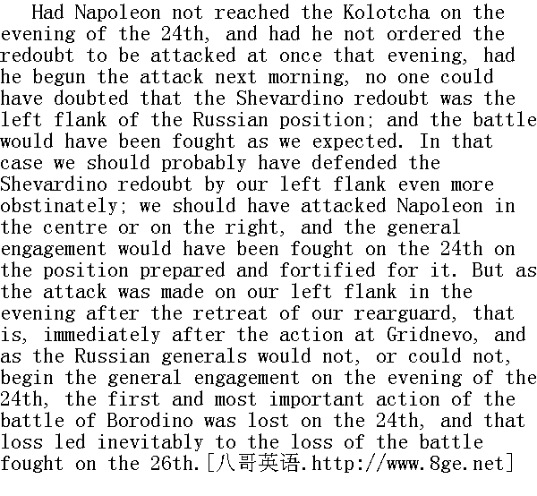 假如拿破仑不在二十四日傍晚到达科洛恰河;假如他当晚没有立刻下令攻打多面堡, 而是在第二天早晨开始攻打的话, 那么, 就不会有人怀疑舍瓦尔金诺多面堡是我们的左翼了;而战斗也会像我们所预料的那样进行了。在那种情况下, 我们大概会像我们所预料的那样进行了。在这种情况下, 我们大概会顽强地守卫舍瓦尔金诺多面堡, 与此同时, 从中央或者从右面攻击拿破仑, 而二十四日大会战就会在预定的修筑有工事的阵地上进行了。但是, 因为对我们左翼进攻是在紧接着我们的后卫撤退的晚上, 也就是在格里德涅瓦战役刚结束的晚上发生的, 还因为俄国的军事将领不愿意或者来不及在二十四日晚上就开始大会战, 以致波罗底诺战役的第一仗, 也是主要的一仗, 在二十四日就打输了, 而且显然导致二十六日那一仗的失败。 After the loss of the Shevardino redoubt, we found ourselves on the morning of the 25th with our left flank driven from its position, and were forced to draw in the left wing of our position and hurriedly fortify it were we could. 在舍瓦尔金诺多面堡沦陷后, 二十五日清晨我们已经没有左翼阵地了, 于是不得不把左翼往后撤, 随便选择一个地方仓促地构筑工事。 So that on the 26th of August the Russian troops were only defended by weak, unfinished earthworks, and the disadvantage of that position was aggravated by the fact that the Russian generals, not fully recognising the facts of the position (the loss of the position on the left flank, and the shifting of the whole field of the coming battle from right to left), retained their extended formation from Novoe to Utitsa, and, consequently, had to transfer their troops from right to left during the battle. Consequently, we had during the whole battle to face the whole French army attacking our left wing, with our forces of half the strength. 但是, 只说俄军仅用薄弱的、未筑成的工事来防守还不够, 更加不利的情况还在于, 俄军将领不承认显而易见的既成事实(左翼已失守, 当前的战场已经从右面向左面转移), 仍停留在诺沃耶村至乌季察这一带拉长的阵地上, 因此, 在战斗开始后, 不得不把军队从右方调到左方。这样一来, 在整个战斗期间, 俄国方面仅有对方一半的兵力用以抵抗法军对我军左翼的进攻 (Poniatovsky's action facing Utitsa and Uvarov's action against the French right flank were quite independent of the general course of the battle.) (波尼亚托夫斯基对乌季察的进攻以及乌瓦罗夫从右翼攻击法军, 只是大会成进程中的单独的军事行动)。 And so the battle of Borodino was fought, not at all as, in order to cover the blunders of our commanders, it is described by our historians, whose accounts, consequently, diminish the credit due to the Russian army and the Russian people. The battle of Borodino was not fought on a carefully picked and fortified position, with forces only slightly weaker on the Russian side. After the loss of the Shevardino redoubt, the Russians fought on an open, almost unfortified position, with forces half the strength of the French, that is, in conditions in which it was not merely senseless to fight for ten hours and gain a drawn battle, but incredibly difficult to keep the army for three hours together from absolute rout and flight. 由此可见, 波罗底诺战役完全不像人们描绘的那样(极力隐瞒我们军事将领们的错误, 从而贬低俄国军队和人民的光荣)。波罗底诺战役并不是在一个选定的, 设了防的阵地上进行的, 也不是俄军的兵力仅仅稍弱于敌军, 实际上俄国人由于失掉舍瓦尔金诺多面堡, 不得不在一个开阔的, 几乎没有防御工事的地带, 兵力比法军少一半的情况下迎接波罗底诺战役, 也就是说, 在这样的条件下, 不仅战斗十小时和打一场不分输赢的战役不可思议, 就是坚持三小时而不使军队完全崩溃和逃遁也是不可思议的。
