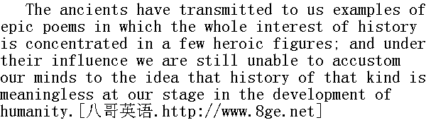 八月二十四日, 在舍瓦尔金诺多面堡打了一仗, 二十五日, 双方都没有开火, 二十六日, 波罗底诺战役爆发了。 How and with what object were the battles of Shevardino and Borodino fought? Why was the battle of Borodino fought? There was not the slightest sense in it, either for the French or for the Russians. The immediate result of it was, and was bound to be, for the Russians, that we were brought nearer to the destruction of Moscow (the very thing we dreaded above everything in the world); and for the French, that they were brought nearer to the destruction of their army (which they, too, dreaded above everything in the world). That result was at the time perfectly obvious, and yet Napoleon offered battle, and Kutuzov accepted it. 舍瓦尔金诺和波罗底诺两次战役是为了什么呢?是怎样挑起、怎样应战的呢?为什么又打起波罗底诺战役呢?不论是对法国人还是对俄国人来说, 这次战役都是毫无意义的。这次战役, 对俄国人来说, 最直接的结果曾是也必然是促进莫斯科的毁灭(这是我们最担心的), 对法国人来说, 则是促进他们的全军覆没(这也是他们怕得要命的)。这个结果甚至在当时也是非常明显的, 然而拿破仑还是发动了这次战役, 库图佐夫也奋起应了战。 If military leaders were guided by reasonable considerations only, it would seem that it must have been clear to Napoleon that in advancing two thousand versts into the heart of the country and giving battle, with the probable contingency of losing a quarter of his men, he was going to certain destruction; and that it must have been equally clear to Kutuzov that in accepting that battle and risking the loss of a fourth of his army, he would infallibly lose Moscow. For Kutuzov this was mathematically clear, as clear as it is at chess, that if I have one piece less than my adversary and I exchange pieces, I am certain to be a loser by it, and therefore must avoid exchanging pieces. When my adversary has sixteen pieces and I have fourteen, I am only one-eighth weaker than he; but when we have exchanged thirteen pieces, he is three times as strong as I am. 如果两位统帅均以理智为指南, 拿破仑似乎应当明白, 深入俄国两千俄里, 在很有可能损失四分之一军队的情况下发动一场大战, 他必将趋于毁灭;库图佐夫也似乎同样应当明白, 冒着损失四分之一军队的军队应战, 他准会失掉莫斯科。这在库图佐夫就像做算术题一样明显, 比如下跳棋, 我方少一个子儿, 而要跟对方对拼子儿, 我方一定会输, 因为不应当对拼。 Up to the battle of Borodino our forces were approximately five-sixths of the French, but after that battle they were only one-half-that is, before the battle a hundred thousand against a hundred and twenty thousand, and after the battle fifty thousand against a hundred thousand. And yet the shrewd and experienced Kutuzov fought the battle. Napoleon, a military genius, as he is called, gave battle, losing a fourth of his army and drawing his line of communications out further than ever. If we are told that he expected the taking of Moscow to complete the campaign, as the taking of Vienna had done, we may say that there are many evidences to the contrary. Napoleon's historians themselves tell us that he wanted to halt as soon as he reached Smolensk; that he knew the danger of his extended line, and that he knew that the taking of Moscow would not be the end of the campaign, because from Smolensk he had learned in what condition the towns were left when abandoned to him, and he had not received a single reply to his reiterated expressions of a desire to open negotiations. 当对方有十六个子儿, 我方有十四个子儿的时候, 我方只比对方弱八分之一;但是如果我方拼掉了十三个子儿, 对方就比我方强三倍了。在波罗底诺战役之前, 我方兵力与法军相比, 大致是五比六;战役之后, 是一比二, 也就是战役以前是十万比十二万, 战役以后是五万比十万。然而聪明且富有经验的库图佐夫应战了。被人称为天才统帅的拿破仑发动了那次战役, 损失了四分之一的兵力, 更拉长了战线。如果说他认为占领莫斯科就像占领维也纳一样, 可以结束战争, 那么他错了, 有许多证据证明并非如此。拿破仑的史学家们亲口说, 他在占领了斯摩棱斯克之后就想停止前进, 他知道拉长战线的危险, 也知道占领莫斯科不会是战争的终结, 因为在斯摩棱克他就看到, 留给他的那些俄国城市是怎样的情景, 他一再表示愿意进行谈判, 但一次也没有得到答复。 In giving and accepting battle at Borodino, Kutuzov and Napoleon acted without design or rational plan. After the accomplished fact historians have brought forward cunningly devised evidences of the foresight and genius of the generals, who of all the involuntary instruments of the world's history were the most slavish and least independent agents. 拿破仑和库图佐夫发动和应接波罗底诺战役都是不由自主和毫无意义的。但是后来史学家们用这些既成事实强牵附会地证明两个统帅的预见和天才。其实, 这些统帅不过是历史的工具, 且是所有不由自主的历史工具中最不自由、最不由自主的活动家。