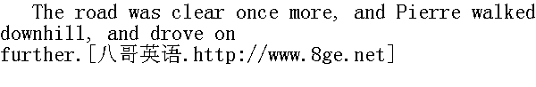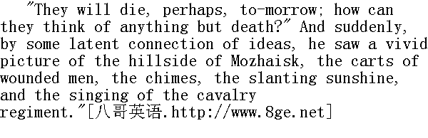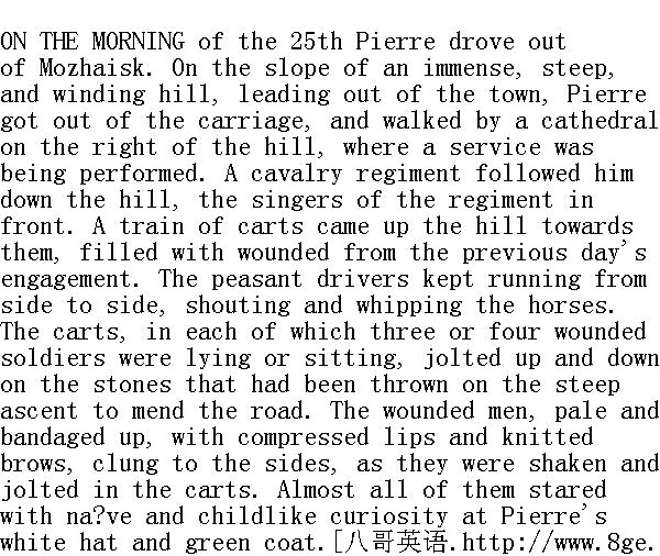 咳, 你在哪儿......倔强的人......" they sang the military dance tune. As though seconding them, though in a different tone of gaiety, clanged out the metallic notes of the chimes at the top of the hill. And the hot rays of the sun bathed the top of the opposite slope with sunshine sparkling with another suggestion of gaiety. But where Pierre stood under the hillside, by the cart full of wounded soldiers, and the panting, little nag, it was damp, overcast, and dismal." 你流落在异乡......"他们唱着士兵舞曲。仿佛是响应他们, 山坡高处不断地发出叮当的钟声, 别有一番欢乐意味。此外, 还有一种别样的欢乐: 对面山坡顶上沐浴着灼热的阳光, 可是山坡下, 伤兵车旁边, 喘息着的小马附近, 皮埃尔站着的地方, 却充满着潮湿、阴暗和忧伤。 The soldier with the wounded cheek looked angrily at the singing horse soldiers. 那个肿脸的士兵怒气冲冲地望着骑兵歌手们。 "Oh, the smart fellows!" he murmured reproachfully." 嗬, 花花公子!"他责备地说。 "It's not soldiers only, but peasants, too, I have seen to-day! Peasants, too, they are hunting up," said the soldier standing by the cart, addressing himself to Pierre, with a melancholy smile. "They can't pick and choose now. ... They want to mass all the people together-it's a matter of Moscow, you see. There is only one thing to do now." In spite of the vagueness of the soldier's words, Pierre fully grasped his meaning, and nodded his head approvingly." 这个年头, 不仅看见了士兵, 也看见了农夫!农夫也被赶上战场, "那个站在车后面的士兵面露苦笑对皮埃尔说, "现在什么都不分了......要老百姓都一齐冲上去, 一句话--为了莫斯科。他们要拼到底啊。"尽管那个士兵说得不清楚, 皮埃尔仍明白了他的意思。赞同地点点头。