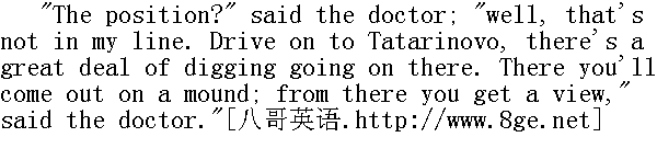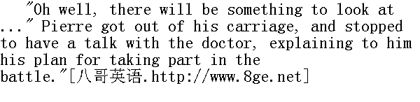 对了, 对了, 就要有可看的了......"皮埃尔下了车, 站在那儿跟医生谈话, 向他说明自己打算参加战斗。 The doctor advised Bezuhov to go straight to his highness. 医生劝别祖霍夫直接去见勋座。 "Why, you would be God knows where during the battle, out of sight," he said, with a glance at his young companion; "and his highness knows you anyway, and will give you a gracious reception. That's what I should do, my friend," said the doctor." 在开战的时候, 您何必要到这个谁也不知道, 谁也找不到的地方来。"他说, 向年轻的同事递了个眼色, "不管怎么说, 勋座总认识您, 他会厚待您的。老兄, 就这么办吧。"医生说。 The doctor seemed tired and hurried. 医生好像很疲倦而且很匆忙。 "So you think. ... But one thing more I wanted to ask you, where is the position exactly?" said Pierre." 您是这么考虑的......不过我还想问您, 阵地在哪儿?"皮埃尔说。