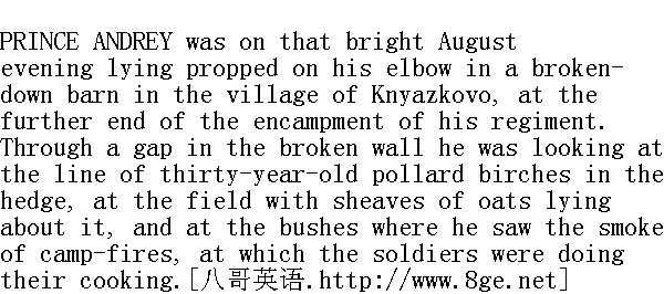 八月二十五日, 晴朗的八月傍晚, 安德烈公爵在克尼亚兹科沃村的一间破旧棚屋里支着臂肘躺着, 他的团就驻在村边。他从破墙的裂缝看见沿着篱笆下面的一排白桦树(枝桠都被砍掉了, 树龄有六十年)和一片堆放着弄乱了的燕麦垛的田地, 以及上面冒着炊烟(士兵们在烧饭)的灌木丛。 Cramped and useless and burdensome as his life seemed now to Prince Andrey, he felt nervously excited and irritable on the eve of battle, just as he had felt seven years earlier before Austerlitz. 安德烈公爵觉得, 现在他的生活尽管憋闷、痛苦, 无人关心, 但仍然像七年前在奥斯特利茨战役前夕那样, 心情激动而焦躁。 He had received and given all orders for the next day's battle. He had nothing more to do. But thoughts-the simplest, most obvious, and therefore most awful-would not leave him in peace. He knew that the battle next day would be the most awful of all he had taken part in, and death, for the first time, presented itself to him, not in relation to his actual manner of life, or to the effect of it on others, but simply in relation to himself, to his soul, and rose before him simply and awfully with a vividness that made it like a concrete reality. And from the height of this vision everything that had once occupied him seemed suddenly illumined by a cold, white light, without shade, without perspective or outline. His whole life seemed to him like a magic lantern, at which he had been looking through the glass and by artificial light. Now he saw suddenly, without the glass, in the clear light of day, those badly daubed pictures. "Yes, yes, there are they; there are the cheating forms that excited torments and ecstasies in me," he said to himself, going over in imagination the chief pictures of the magic lantern of his life, looking at them now in the cold, white daylight of a clear view of death. "These are they, these coarsely sketched figures which seemed something splendid and mysterious. Glory, the good society, love for a woman, the fatherland-what grand pictures they used to seem to me, with what deep meaning they seemed to be filled! And it is all so simple, so colourless and coarse in the cold light of the day that I feel is dawning for me." The three chief sorrows of his life held his attention especially. His love for a woman, his father's death, and the invasion of the French-now in possession of half of Russia. "Love! ... That little girl, who seemed to me brimming over with mysterious forces. How I loved her! I made romantic plans of love, of happiness with her! O simple-hearted youth!" he said aloud bitterly. "Why, I believed in some ideal love which was to keep her faithful to me for the whole year of my absence! Like the faithful dove in the fable, she was to pine away in my absence from her! And it was all so much simpler. ... It is all so horribly simple and loathsome! 他已经接到并已发出明天作战的有关命令。这时他无事可做。但是最简单、最清晰的思绪, 因而也是最可怕的思绪, 使他不得安宁。他知道, 明天的战斗将是他参加过的一切战斗中最激烈的一次, 他生平第一次生动地、几乎确信无疑地, 而且单纯地恐怖地想到了死亡的可能, 这死亡的可能与尘世生活完全无关, 也不去考虑它对别人会产生什么影响, 它只是关系到他自己、关系到他的灵魂。从这个意念的高度来看, 从前使他痛苦和担心的一切, 忽然被一道寒冷的白光照亮了, 那道白光既无阴影, 也无远景, 也无轮廓的差别。他觉得整个人生有如一盏魔灯, 长期以来, 他透过玻璃, 借助人工的照明来看魔灯里的东西。现在他突然不是透过玻璃, 而是在明晃晃的白昼中看见画得很差劲的图片。"是的, 是的, 这就是曾经使我激动和赞赏、并且折磨过我的那些虚幻的形象, "他自言自语, 在想象中一一再现他的人生魔灯中的主要画面。此时是在白昼的寒光中, 在清楚地意识到死亡的时刻观看这些画面, 这就是那些曾经认为美丽和神秘的拙劣粗糙的画像。"荣誉, 社会的幸福, 对女人的爱情, 甚至祖国--我过去觉得这些图景是多么壮丽, 蕴藏着多么深刻的思想!而今天(我觉得它是为我降临的)在寒冷的白光下, 这一切却如此简单、苍白和粗糙。"他此时的注意力特别集中在他生平三大不幸之事上面。他对女人的爱情, 父亲的去世和占领半个俄国的法国人的入侵。"爱情!......那个我觉得充满了神秘力量的小姑娘。我多么爱她啊!我曾经制定了关于爱情以及和她共同生活的幸福的、富有诗意的计划。啊, 我这个天真的孩子!"他愤恨地高声说。"当然啦!我曾相信理想的爱情, 在我整年不在的时候, 她对我仍忠贞不渝!就像寓言中的温柔多情的小鸽子, 她一定因为和我离别而憔悴。--而这一切都想得太简单了......太简单了, 讨厌!" "My father, too, laid out Bleak Hills, and thought it was his place, his land, his air, his peasants. But Napoleon came along, and without even knowing of his existence, swept him away like a chip out of his path, and his Bleak Hills laid in the dust, and all his life with it brought to nought. Princess Marya says that it is a trial sent from above. What is the trial for, since he is not and never will be? He will never come back again! He is not! So for whom is it a trial? Fatherland, the spoiling of Moscow! But to-morrow I shall be killed; and not by a Frenchman even, maybe, but by one of our own men, like the soldier who let off his gun close to my ear yesterday; and the French will come and pick me up by my head and my heels and pitch me into a hole that I may not stink under their noses; and new conditions of life will arise, and I shall know nothing of them, and I shall not be at all."" 我父亲也曾建设童山, 