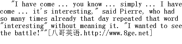 我来......嗯......您知道......我来......我觉得很有趣。"皮埃尔说, 他这一天已经多次无意识地重复"有趣"这个字眼了。"我想看一看战斗的情况。" "Yes, yes; but your mason brethren, what do they say of war? How would they avert it?" said Prince Andrey sarcastically. "Well, tell me about Moscow. And my people? Have they reached Moscow at last?" he asked seriously." 是的, 是的, 共济会员们对战争有什么看法?怎样才能防止战争啊!"安德烈公爵讥讽地说, "莫斯科怎么样?我家里的人怎么样?他们终于都到莫斯科了吗?"他认真地问道。 "Yes. Julie Drubetskoy told me so. I went to call, but missed them. They had started for your Moscow estate."" 他们都到了。是朱莉·德鲁别茨卡娅告诉我的。我去看过他们, 但是没有遇见。他们到莫斯科近郊的庄园去了。"