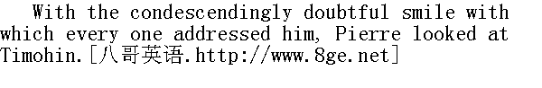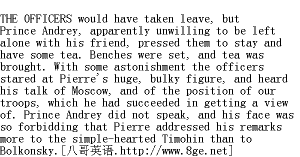 军官们要告辞了, 但安德烈公爵好像不愿和他的朋友单独呆在一起, 于是请他们再坐一会儿, 喝杯茶。板凳和茶都端来了。军官们不无惊讶地望着皮埃尔肥胖而庞大的身躯, 听他讲莫斯科的情形, 讲他在巡视中见到的我军的部署。安德烈公爵沉默着, 脸色显得那样阴沉, 弄得皮埃尔在讲话时不得不更多地对着和善的营长季莫欣, 而较少地对着博尔孔斯基。 "So you understand the whole disposition of the troops?" Prince Andrey put in." 那么整个军队的部署你都清楚了?"安德烈公爵打断他的话说。 "Yes. At least, how do you mean?" said Pierre. "As I am not a military man, I can't say I do fully; but still I understand the general arrangement."" 是的, 怎么?"皮埃尔说, "我不是军人, 不敢说全弄懂了, 但大体的部署总算弄清楚了。" "Well, then, you know more than anybody else," said Prince Andrey. "Eh bien, vous etes plus avance que qui cela soit."①安德烈公爵说。 "Oh!" said Pierre incredulously, looking over his spectacles at Prince Andrey. "Well, and what do you say of the appointment of Kutuzov?" he asked." 啊!"皮埃尔狐疑地应了一声, 透过眼镜片盯着安德烈公爵。"您对任命库图佐夫有什么看法?"他说。 "I was very glad of his appointment; that's all I know," said Prince Andrey." 对此我非常高兴, 我所知道的就是这些。"安德烈公爵说。 "Well, tell me your opinion of Barclay de Tolly. In Moscow they are saying all kinds of things about him. What do you think of him?"" 嗯, 请您谈谈您对巴克莱·德·托利有什么看法?在莫斯科天知道人们都怎样谈论他。您觉得他怎么样?" "Ask them," said Prince Andrey, indicating the officers." 你问他们。"安德烈公爵指着军官们说。