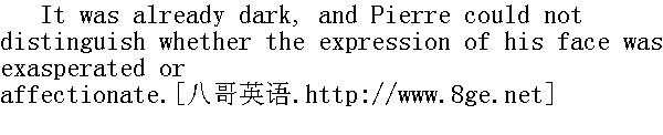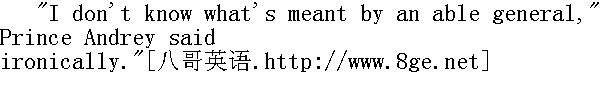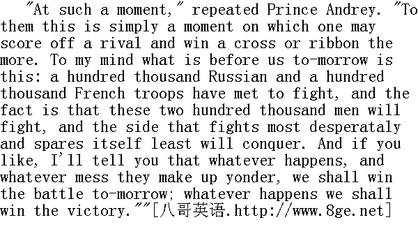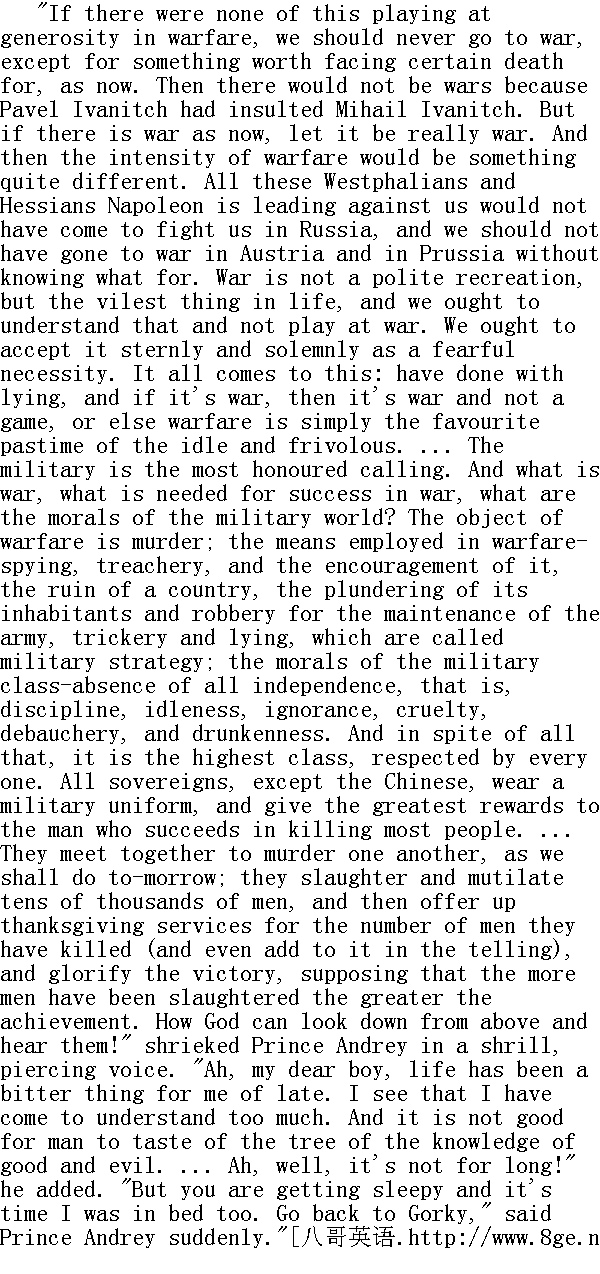 如果战争没有宽大, 那么我们就只有在值得赴死的时候, 就像现在这样, 才去打仗了。那时, 就不会因为保罗·伊万诺维奇得罪了米哈伊尔·伊万诺维奇而开战了。只有像现在这次战争, 才算是战争。那时, 军队的紧张程度就不会像现在这样。那时, 拿破仑所率领的这些威斯特法利亚人和黑森①人就不会跟随他到俄国来了, 我们也不会莫名其妙地到奥国和普鲁士去打仗了。战争不是请客吃饭, 而是生活中最丑恶的事情, 应当了解这一点, 不要把战争当儿戏。要严肃认真地对待这一可怕的必然性。这就在于: 去掉谎言, 战争就是战争, 而不是儿戏。不然, 战争就成为懒汉与轻浮之辈喜爱的消遣了......军人阶层是最受尊敬的。但是什么是战争呢?怎样才能打胜仗?军界的风气是怎样的?战争的目的是杀人, 战争的手段是间谍, 叛变, 对叛变的鼓励, 蹂躏居民, 为了军队的给养抢劫他们或者盗窃他们, 欺骗和说谎被称为军事的计谋。军人阶层的习俗是没有自由, 也就是说, 守纪律、闲散, 愚昧无知, 残忍成性, 荒淫和酗酒。虽然如此, 军人仍是人人都尊敬的最高阶层。所有帝王, 除了中国例外, 都穿军服, 而且谁杀人最多, 谁就得到最高奖赏......就像明天那样, 人们凑在一起互相屠杀, 有好几万人被杀死或被打成残废, 然后因为杀死了许多人(甚至夸大伤亡的数字)举行感恩祈祷, 隆重地宣布胜利。认为杀人越多, 功劳越大, 上帝怎样从天上看他们, 听他们啊!"安德烈公爵喊道, 声音又尖又细。"啊, 我的好朋友, 近来我太难过了, 我发现我懂得太多了。人不能吃那可以分辨善恶的果子②......唉, 日子不长了!"他又说。"不过, 你该休息了, 我也该睡了, 你快回戈尔基吧。"安德烈公爵突然说。 ①威斯特法利亚人是今德意志联邦共和国西部威斯特法伦州居民, 一八○七至一八一五年, 拿破仑在此建立王国。黑林人是前德意志联邦共和国西南部黑森州居民。 ②故事见《圣经·旧约·创世纪》第二章。 "Oh no!" answered Pierre, gazing with eyes full of scared sympathy at Prince Andrey." 啊, 不!"皮埃尔回答说, 用吃惊、同情的目光望着安德烈公爵。 "You must be off; before a battle one needs to get a good sleep," repeated Prince Andrey. He went quickly up to Pierre, embraced and kissed him. "Good-bye, be off," he cried, "whether we see each other again or not ..." and turning hurriedly, he went off into the barn." 走吧, 走吧, 战斗前必须好好睡一觉。"安德烈公爵又说了一遍。他快步走到皮埃尔跟前, 拥抱他, 吻他。"再见, 你走吧, "他喊道。"我们会不会再见面, 不会......"他连忙转身走回棚屋。