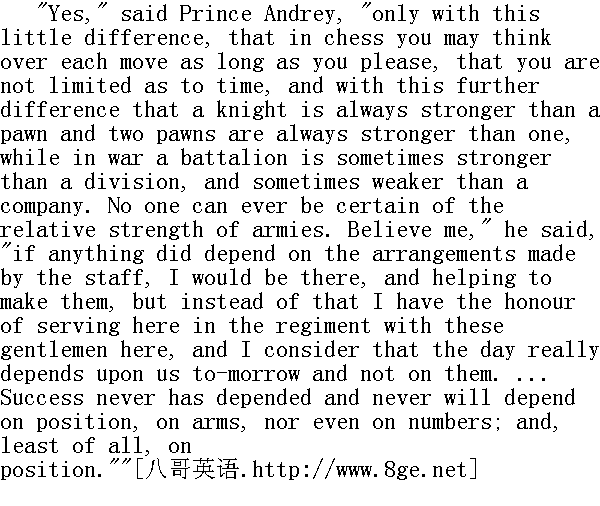 是的, "安德烈公爵说, "不过有点区别, 下棋每走一步, 你可以随便想多久, 下棋不受时间的限制, 另外还有一点区别, 那就是马永远比卒强, 两个卒比一个卒强, 而在战争中, 一个营有时比一个师还强, 也有时反倒不如一个连。任何人都弄不清军队的相对力量。相信我, "他说, "如果说参谋部的部署具有决定性的作用, 那么, 我就在那儿从事部署工作了, 但是我没有那样做, 而荣幸地到这儿, 到团里服务, 和这些先生们共事, 我认为明天的战斗确实取决于我们, 而不是取决于他们......胜利从来不取决于将来, 也不取决于阵地, 也不取决于武装, 甚至不取决于数量, 特别是不取决于阵地。" "On what then?"" 那么取决于什么呢?" "On the feeling that is in me and him," he indicated Timohin, "and every soldier."" 取决于士气--我的, 他的, "他指着季莫欣说, "以及每个士兵的士气。" Prince Andrey glanced at Timohin, who was staring in alarm and bewilderment at his colonel. In contrast to his usual reserved taciturnity, Prince Andrey seemed excited now. Apparently he could not refrain from expressing the ideas that suddenly rose to his mind. "The battle is won by the side that has firmly resolved to win. Why did we lose the battle of Austerlitz? Our losses were almost equalled by the French losses; but we said to ourselves very early in the day that we were losing the battle, and we lost it. And we said so because we had nothing to fight for then; we wanted to get out of fighting as quick as we could. 'We are defeated; so let us run!' and we did run. If we had not said that till evening, God knows what might not have happened. But to-morrow we shan't say that. You talk of our position, of the left flank being weak, and the right flank too extended," he went on; "all that's nonsense; that's all nothing. But what awaits us to-morrow? A hundred millions of the most diverse contingencies, which will determine on the instant whether they run or we do; whether one man is killed and then another; but all that's being done now is all mere child's play. The fact is that these people with whom you have been inspecting the positions do nothing towards the progress of things; they are a positive hindrance. They are entirely taken up with their own petty interests." 安德烈公爵向季莫欣看了一眼, 季莫欣惊恐地、困惑不解地望着他的团长, 安德烈公爵一反平时沉默寡言的矜持态度, 现在似乎激动起来了。显然他情不自禁地要说出此时闪现在他的脑际的那些思想。"谁下定决心去争取胜利, 谁就能胜利。为什么奥斯特利茨战役我们吃了败仗?我们的损失几乎和法国人一样, 但是我们过早地认输了, --所以就失败了。而我们所以认输, 因为我们无须在那儿战斗: 一心想快点撤离战场。'打败了--赶快逃跑吧!'于是我们逃跑了。假如直到明天我们都不说这话, 那么, 天知道又会是怎样一番情景了。明天我们就不会说这话了。你说: 我们的战线, 左翼太弱, 右翼拉得太长, "他继续说, "这全是扯淡, 完全不是这回事。明天我们面临着什么?千百万个形形色色的偶然事件在瞬息之间就决定了胜负, 这要看: 是我们还是他们逃跑或将要逃跑, 是这个人被打死, 或者那个人被打死;至于现在所做的一切全是一场游戏。问题是, 和你一起巡视阵地的那些人, 不仅对促进整个战役的进展不会有帮助, 而且只有妨碍。他们只关心自己的微薄的利益。" "At such a moment?" said Pierre reproachfully." 在这关键的时刻吗?"皮埃尔责怪地问。