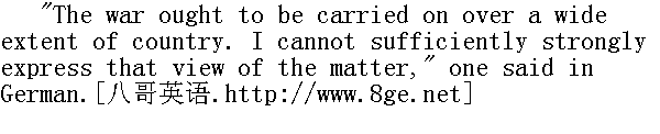 "Der krieg muss im Raum verlegt werden.Der Ansicht kann ich nicht genug Preis geben."②其中一个说。 ②德语: 战争应当移到广阔的地带, 这个意见我十分赞赏。 "Oh yes," said another voice, "since the object is to wear out the enemy, one must not consider the losses of private persons." "Oh, ja "另一个说, "der Zweck ist nur den Feind zu schwaCchen, so kann man gewiss nicht den Verlust der Privat Personen in Achtung nehmen."③ "Certainly not," acquiesced the first voice. "Oh, ja "第一个同意说。 "Carried into a wide extent of country," Prince Andrey repeated with a wrathful snort, when they had ridden by. "In that open country I had a father and son and sister at Bleak Hills. He doesn't care about that. That's just what I was saying to you: these excellent Germans won't win the battle to-morrow, they will only make a mess of it, so far as they are able, because they have nothing in their German noddles but calculations that are not worth a rotten egg, and they haven't in their hearts the one thing that's wanted for to-morrow, that Timohin has. They have given all Europe up to him, and now they have come to teach us-fine teachers!" he added, his voice growing shrill again" 是的, im Raum Verlegen, "④当他们走过后, 安德烈公爵气愤地哼了一声。"留在童山的我的父亲、儿子、妹妹, 就在那im Ruam。这对他无所谓。刚才我不是对你说来着, --这些德国先生们明天不是去打赢这场战斗, 而是尽其所能去搞破坏, 因为德国人的头脑中只有连一个空蛋壳都不值的空洞理论, 而他们心里就是缺少明天所必需的东西, 也就是季莫欣所有的那种东西。他们把整个欧洲都奉送他了, 现在来教训我们--真是好老师啊!"他又尖叫了起来。 ④德语: 移到广阔的地带。