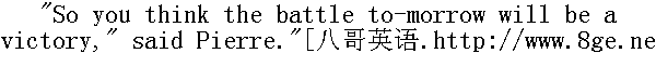 在·这·关·键·时·刻。"安德烈公爵重复地说了一句, "对他们来说, 这个时刻不过是能够暗害对手和多得一枚十字勋章或一条绶带的机会罢了。明天对我来说, 那就是, 十万俄国军队和十万法国军队聚在一起互相厮杀, 事实是, 这二十万人在厮杀的时候, 谁打得最凶, 且不惜牺牲, 谁就会取胜。你想知道的话, 我可以告诉你, 不管那儿出现什么情况, 也不管上层是如何妨碍, 明天我们一定胜利。明天不管那儿怎么样, 我们一定胜利!" "Your excellency, that's the truth of it, the holy truth," put in Timohin; "who would spare himself now! The soldiers in my battalion, would you believe it, wouldn't drink their vodka; this isn't an ordinary day, they say."" 大人, 这就是真理, 千真万确的真理。"季莫欣说, "现在还有什么人怕死!我那营的兵, 您信不信, 都不喝酒了: 他们说, 不是喝酒的时候。" All were silent. 大家沉默了一会儿。 The officers rose. Prince Andrey went with them out of the barn, giving the last instructions to the adjutant. When the officers had gone, Pierre came nearer to Prince Andrey, and was just about to begin talking when they heard the tramp of hoofs not far away on the road, and glancing in that direction Prince Andrey recognised Woltzogen and Klausewitz, accompanied by a Cossack. They rode close by them, still talking, and Pierre and Prince Andrey could not help overhearing the following phrases in German: 军官们站起身来, 安德烈公爵同他们走出棚屋, 对副官发出最后一些命令。军官们走后, 皮埃尔走近安德烈公爵, 正要开口说话, 离棚屋不远的路上突然传来了马蹄声, 安德烈公爵往那边一看, 认出是沃尔佐根和克劳塞维兹①, 一个哥萨克跟随着。他们一边谈话, 一边走近来, 皮埃尔和安德列公爵无意中听到以下的话: ①克劳塞维兹(1780~1831), 德国军事理论家, 著有《战争论》一书。一八一二年他在俄国军队中担任普弗尔的副官。